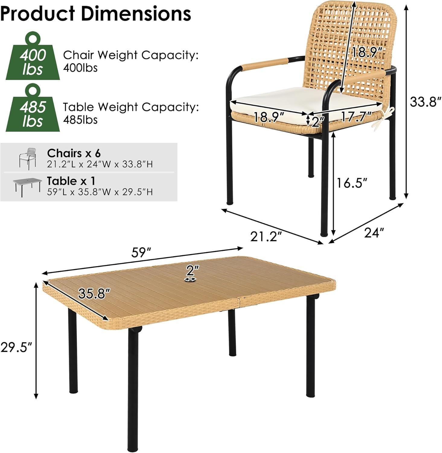 - Practical Patio Dining Set: A classic nature-inspired patio table and chair set is the beautiful addition to your outdoor space. The dinette with a table and 6 chairs is perfect for gathering and just enjoying a relaxing time with family and friends in the garden, patio.