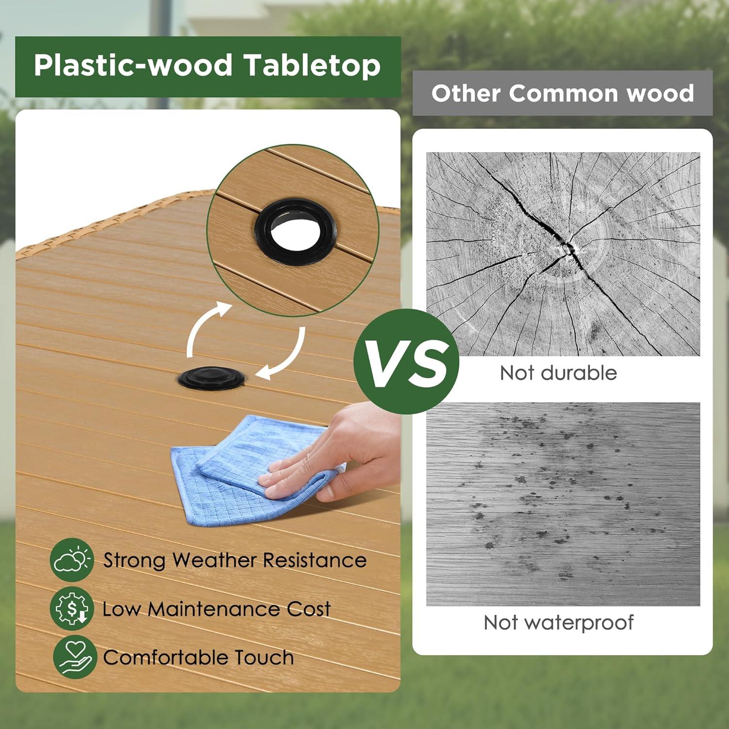 - Tabletop: weather-resistant plastic-wood texture, safe and sturdy
