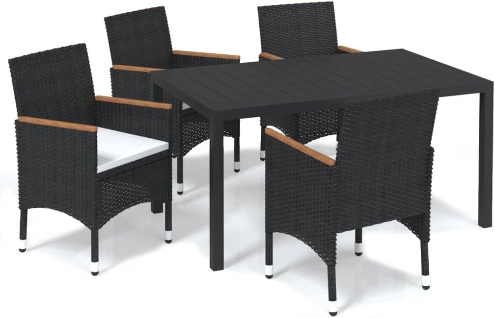 Upon unboxing the set, we immediately noticed the sleek and modern aesthetic created by the black poly rattan weave. This outdoor dining furniture strikes a perfect balance between style and durability, crafted to withstand various weather conditions without compromising comfort. The included cushions add a plush touch, making each chair inviting for longer stays, whether for a casual brunch on the balcony or an evening meal in the backyard. The compact 5-piece arrangement includes a spacious table and four chairs, making it an ideal fit for terraces or small outdoor areas, offering both functionality and design elegance.