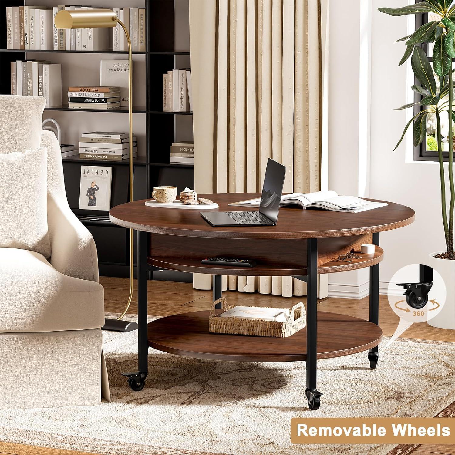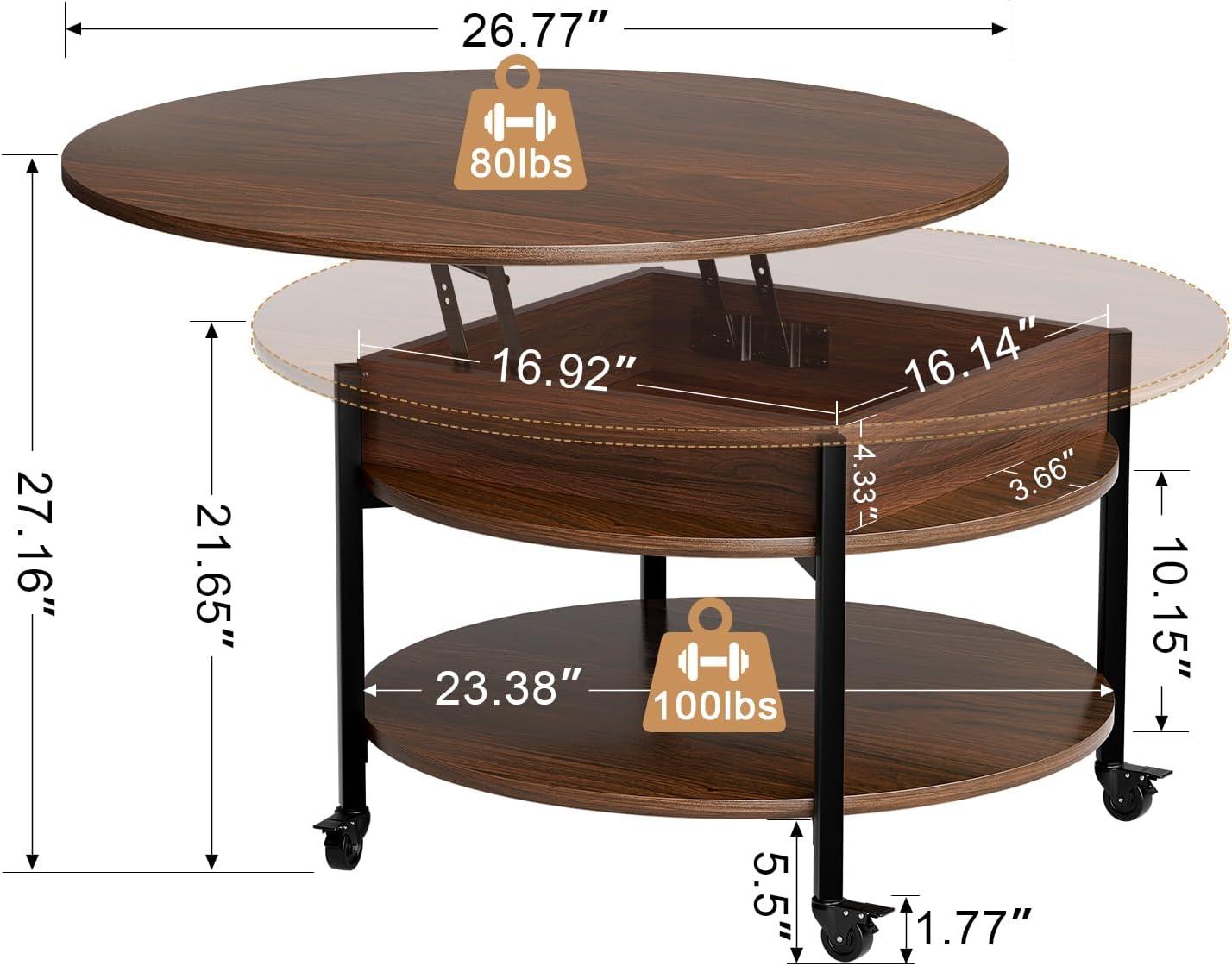 You give the top a gentle lift and it rises with a soft mechanical click, the round surface moving up to meet your hands. It’s the FABATO Round lift Top Coffee Table With Wheels in the room—though you soon think of it simply as the lift-top table—sitting lower than an armchair and spanning just under 27 inches across, small enough to feel intimate. The espresso finish reads dark in the afternoon light, and under your palm the veneer has a faint, reassuring texture rather than a slick plastic sheen. Two tiers create a staggered visual weight, and the casters roll smoothly before settling with a decisive click when locked.Up close the rounded edge feels sturdy, the circular silhouette quietly softening the room’s angles.