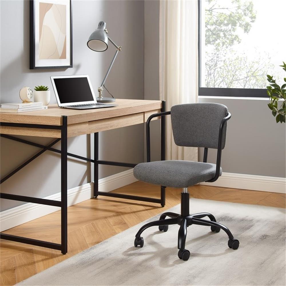 Bringing a modern touch to our workspace, this chair strikes the perfect balance between functional design and aesthetic subtlety. The sleek silhouette enhances the room without overpowering it,while the grey polyurethane fabric offers a neutral tone that blends effortlessly with a variety of décor styles. Its minimalist frame, paired with the black-painted plastic accents, adds an elegant edge, making it an ideal fit for both home offices and professional environments alike. The compact 22-inch width is perfect for saving space without sacrificing presence.