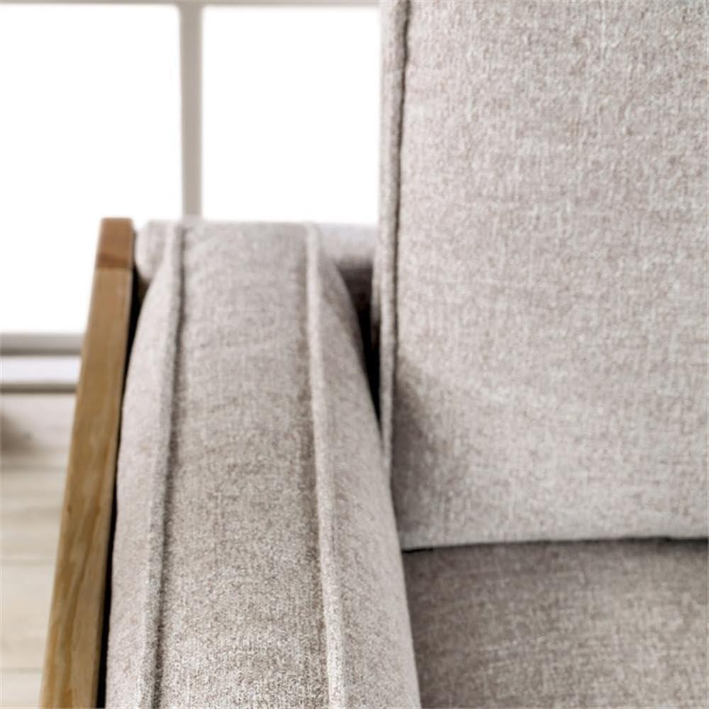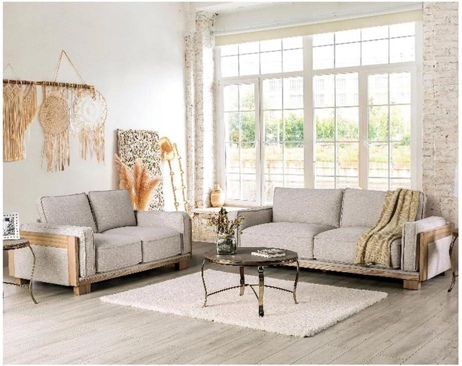 Morning light slides across the cushions and the sofa reads as quietly purposeful rather than flashy. You run a hand along the light-brown fabric and feel a smooth, slightly cool surface; the welted seams keep the lines tidy while the backs stay pleasantly plump. From a few paces the pair—sofa and loveseat—carries a modest visual weight, ash-wood frames showing as pale, rectangular accents that temper the upholstery.This is the Furniture of America Hart Fabric Upholstered 2‑Piece Sofa Set in Light Brown—the Hart set in the room—and up close the cushions sit on a gentle, springy lift that makes the seating feel composed, not sloppy.