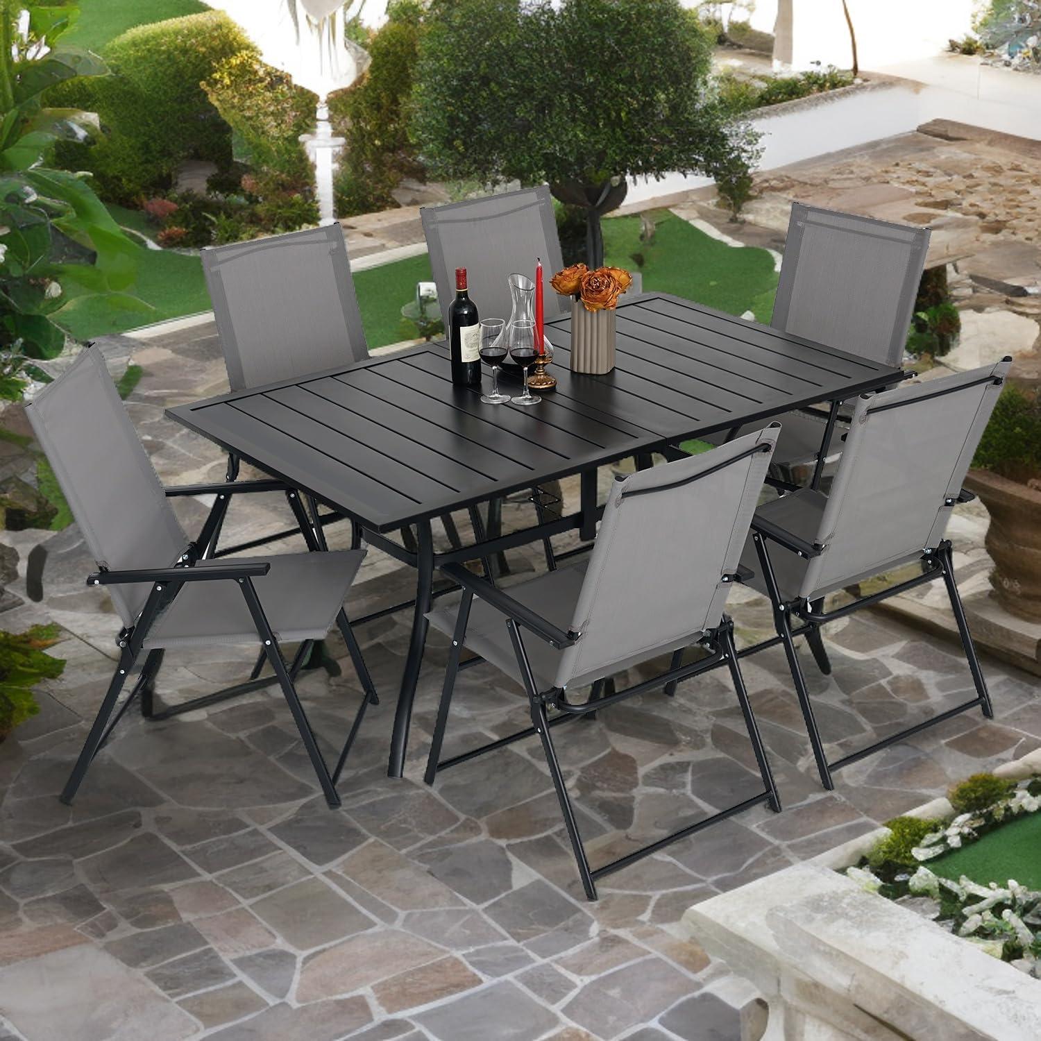 this set is perfectly suited for a variety of outdoor spaces, from cozy garden nooks to spacious backyard patios and modern decks. The rectangular table, featuring a versatile umbrella hole, allows us to easily add shade and comfort during sunny afternoons. Its sturdy metal build withstands outdoor elements, making it an excellent choice for those who want durable furniture that blends style with resilience. The six folding chairs adapt wonderfully to different occasions – whether it’s a casual family dinner or an impromptu gathering with friends, they balance comfort and convenience with their ergonomic design and breathable, weather-resistant fabric.