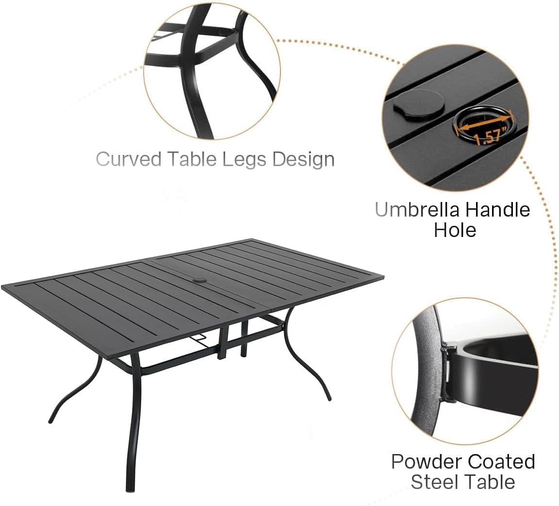 Right out of the box, this outdoor dining set impressed us with its sleek, modern design and practicality. The black rectangular table features a durable metal top equipped with a dual-sized umbrella hole, accommodating most patio umbrellas perfectly to provide much-needed shade on sunny days. The six included chairs are thoughtfully designed with extra-wide 18.3″ seats, ergonomic backrests, and metal armrests, ensuring comfort during long outdoor meals or relaxing afternoons. What stood out is the reinforced metal frame supporting up to 250 lbs per chair, giving a sturdy and reliable feel that makes the set suitable for various users.