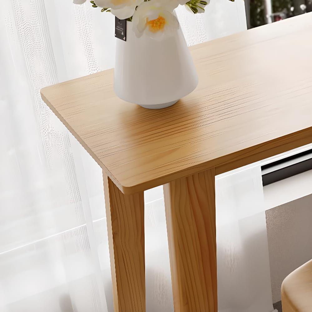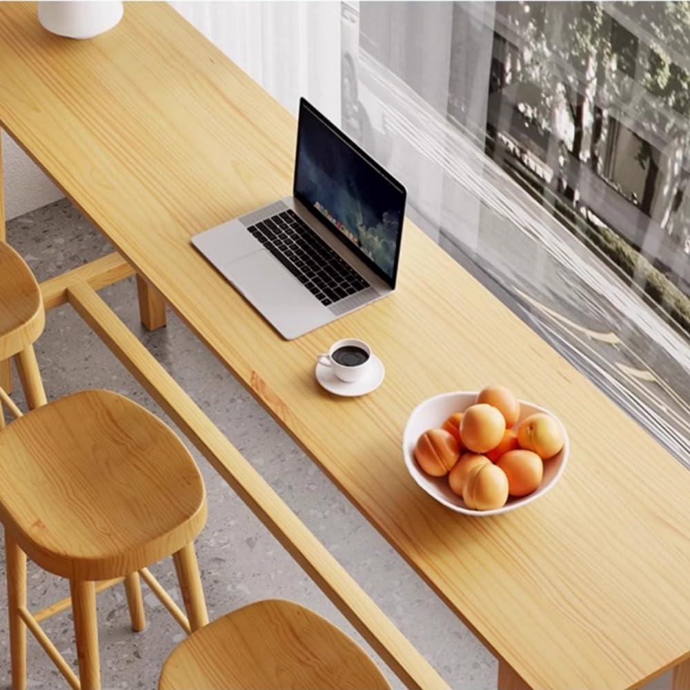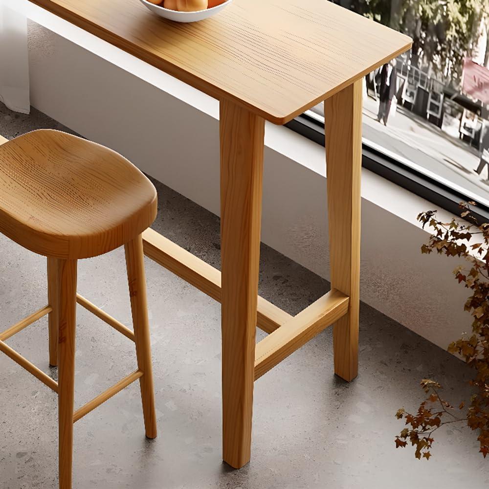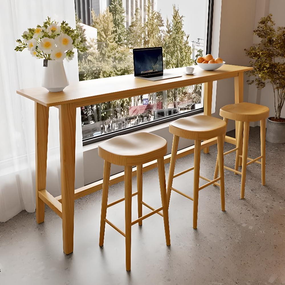 Crafted from solid pine wood with a natural finish, this bar height dining set brings a modern yet warm touch to any indoor space. The table stretches 118 inches in length, offering an ample surface for meals, work, or socializing.Its slim 16-inch width allows it to fit comfortably against a wall, making it perfect for space-conscious rooms. Accompanied by five matching stools, each stool measures 16 by 16 inches with a height of 29.5 inches, providing balanced comfort and stability. The set’s design features a sturdy footrest on the table for added ease, and its scratch-resistant, waterproof surface ensures durability without compromising aesthetics.