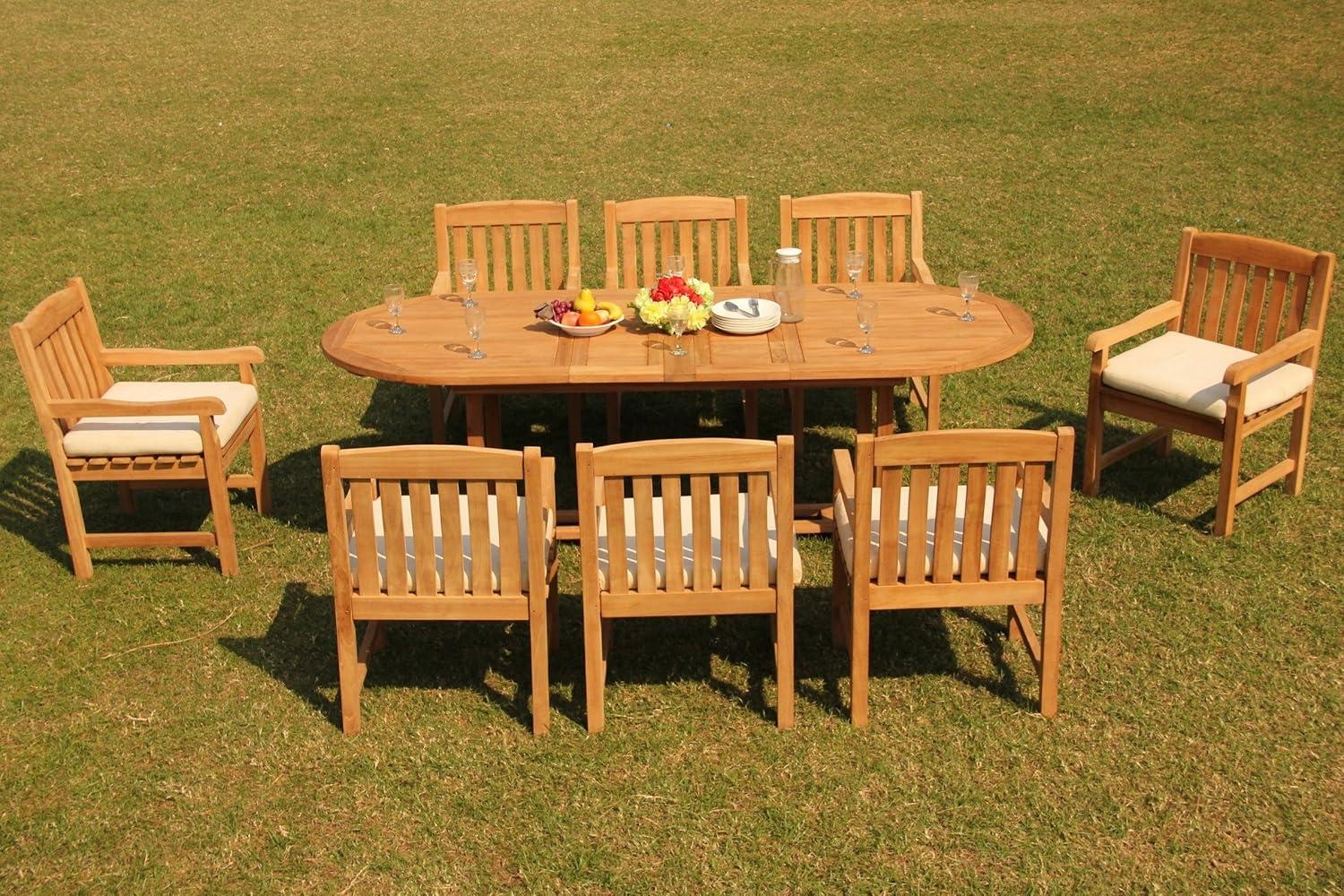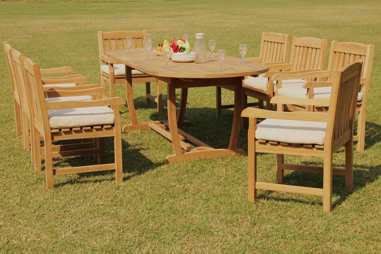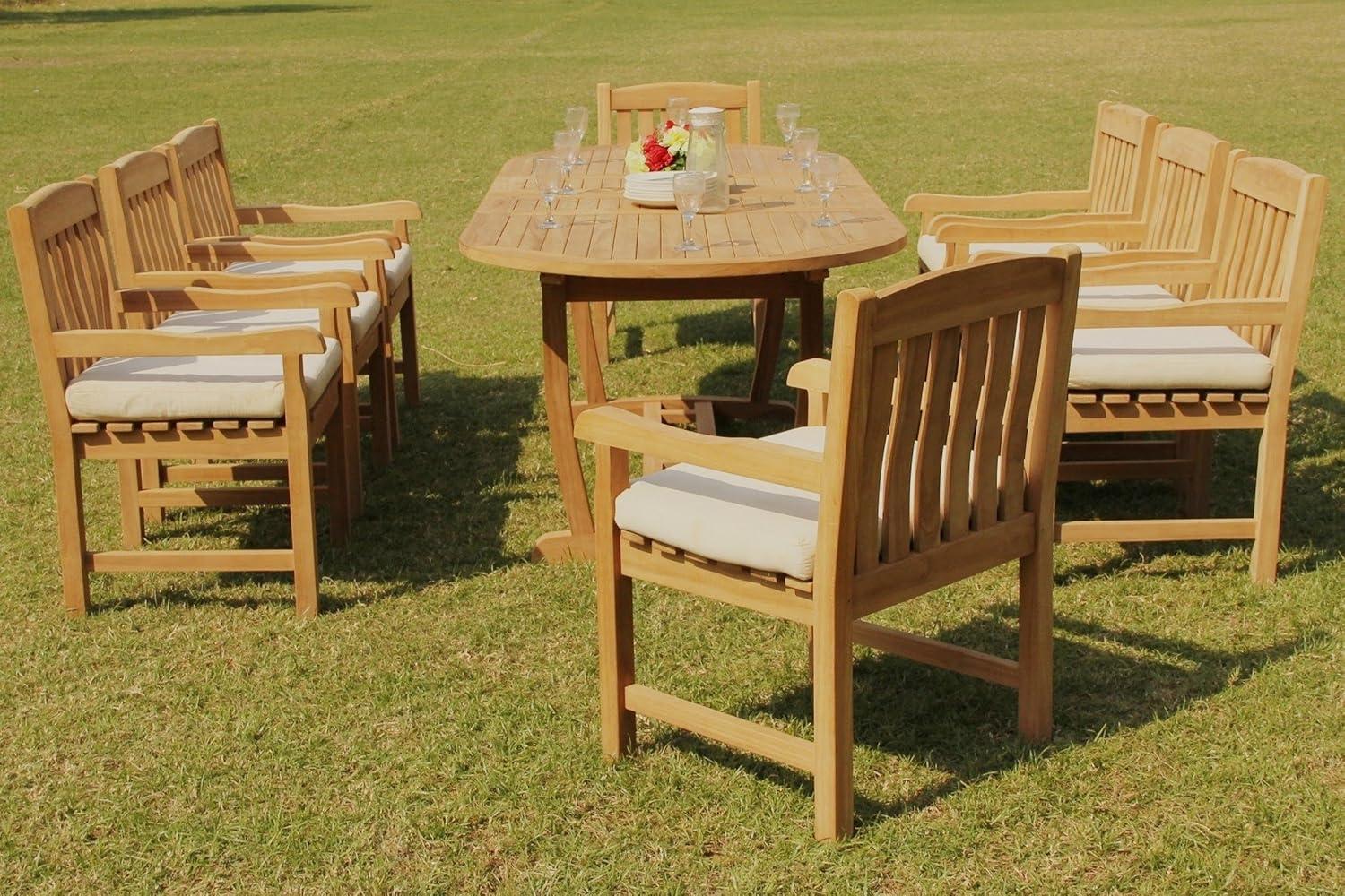 The accompanying 8 Devon Arm/Captain Chairs set this collection apart in terms of comfort and practicality. Their armrests strike a perfect balance between support and freedom of movement, a feature not always found in similar teak dining chairs. Stackability adds a smart storage solution, giving us space-saving convenience seldom seen in bulky outdoor seating. While sunbrella cushions are sold separately, the availability of custom-made cushions specific to the chair models enhances comfort dramatically – a feature some competing sets overlook. Below is a quick comparison table to illustrate how this set fares versus common alternatives: