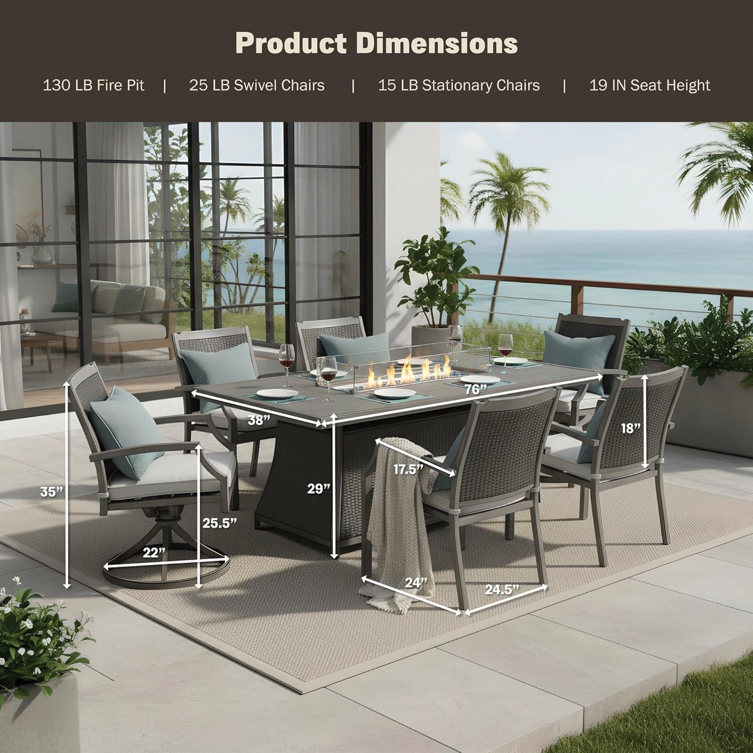 To truly elevate your outdoor gatherings, we recommend positioning the fire pit table centrally to create a warm focal point that encourages cozy conversations. The spacious 76-inch tabletop not only provides ample room for dishes and drinks, but also adds a practical surface for games or decorative accents. Pairing the sturdy, weather-resistant cushions and swivel chairs ensures every guest enjoys comfort while being able to move freely without leaving their spot. For maintenance, keeping the fire pit clean and clear of debris is essential to avoid any hazards and prolong the life of the set.Additionally, while assembling, take care to follow instructions closely, especially to secure all components safely and avoid injuries from sharp edges.