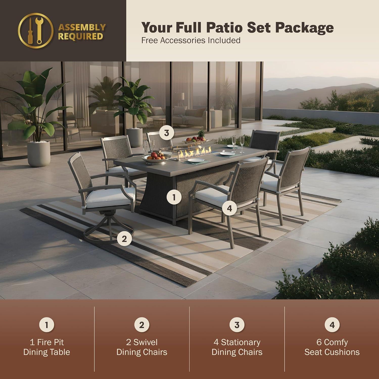 At the heart of this collection is the spacious 76-inch propane fire pit table, boasting a sturdy aluminum top and delivering up to 50,000 BTU of warmth.It not only serves as a cozy gathering point but also provides ample surface area for dining and entertaining. Included are four stationary dining chairs and two swivel chairs-all equipped with plush cushions-which encourage relaxed conversations around the fire. The entire set ships securely on a single pallet with premium delivery service to ensure all pieces arrive safely and ready for assembly.