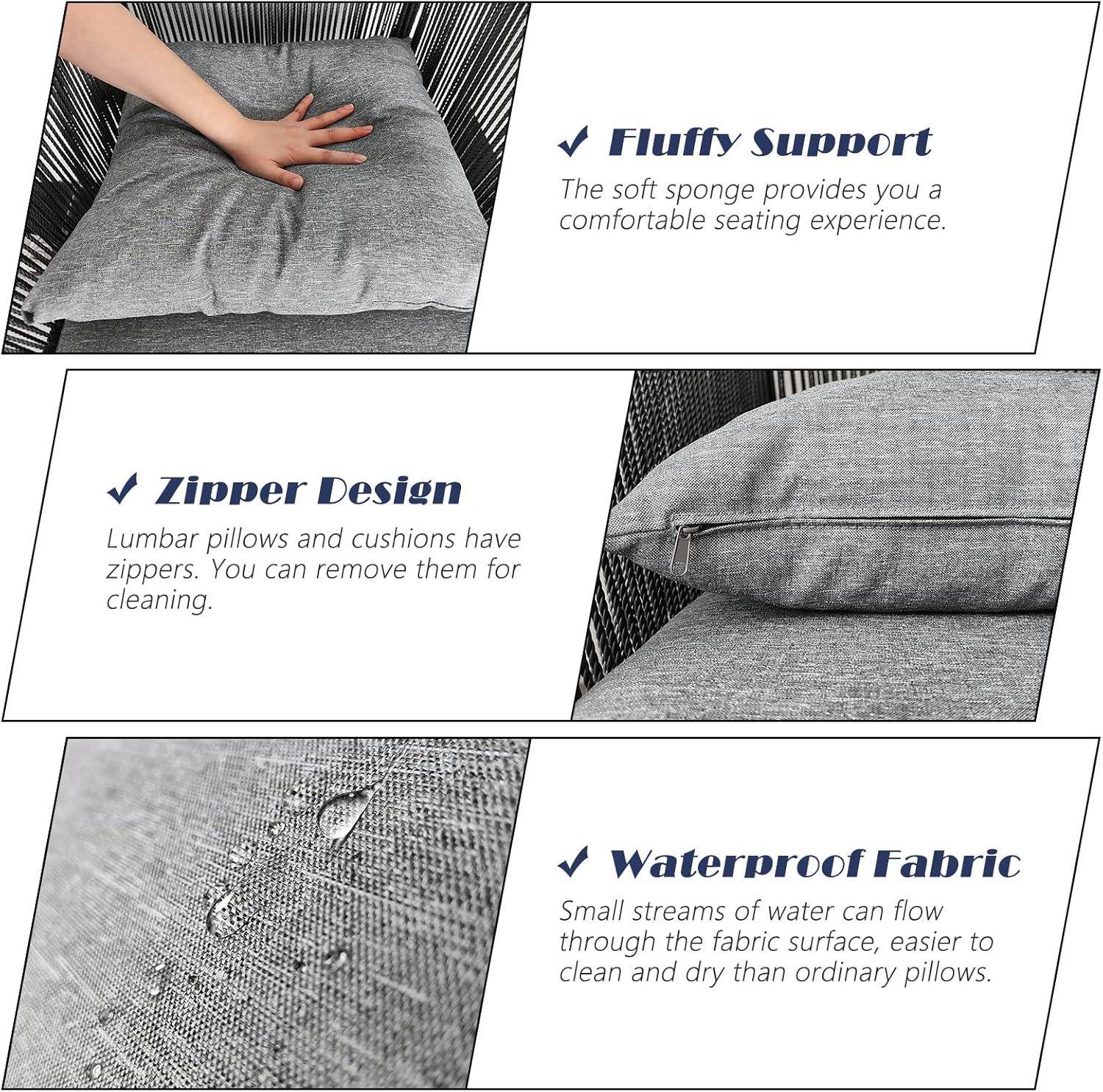 The handmade PVC wicker chairs are equally remarkable, providing a combination of strength and versatility. They dry rapidly after rainfall and have proven to be highly UV-resistant, preventing color fading over time. We also noticed the cushions and pillows boast waterproof, dirt-resistant, and UV-protected outdoor fabric that not only resists wear and tear but is easy to clean with removable covers. Below is a quick overview of the features that contribute to long-lasting durability and weather resilience: