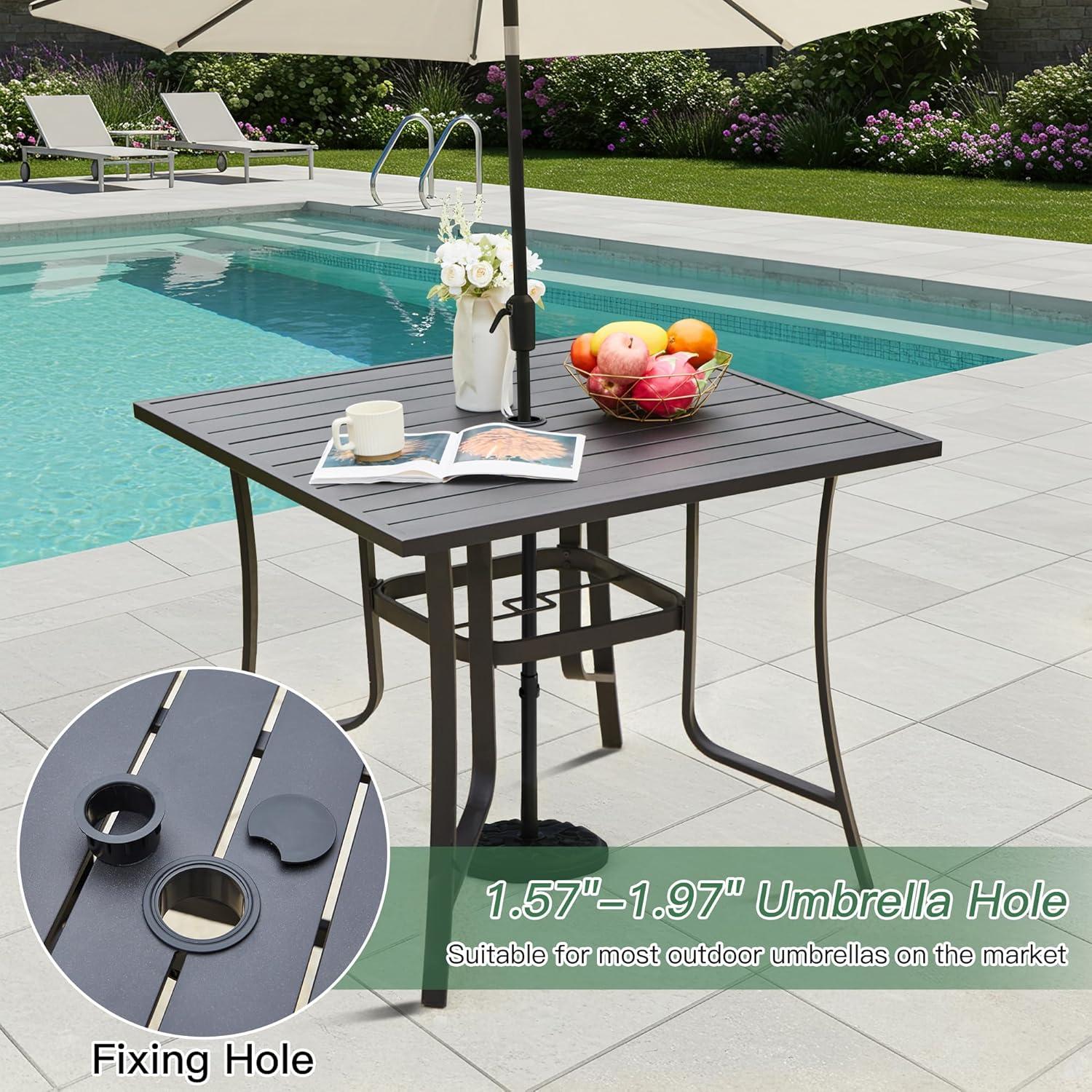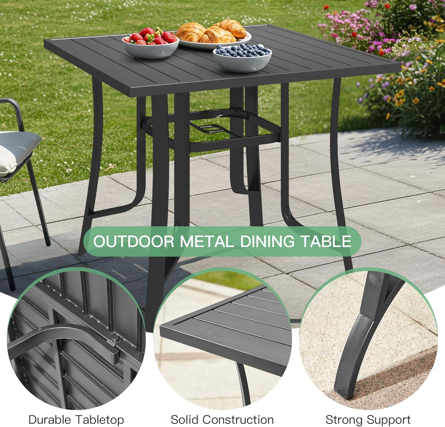 When assessing outdoor dining sets in this category, this particular set stands out by balancing durability and aesthetic appeal. The wrought iron frame treated with powder coating offers superior resistance to rust and weather – a feature not universally found in comparable products. Its slatted tabletop design not only ensures water drainage but also simplifies maintenance, which is a clear advantage over solid-surface tabletops that may retain moisture. The inclusion of a centrally pre-cut umbrella hole is a thoughtful touch, enhancing usability while offering protection from sun exposure, a feature frequently enough missing or awkwardly designed in similar square sets.