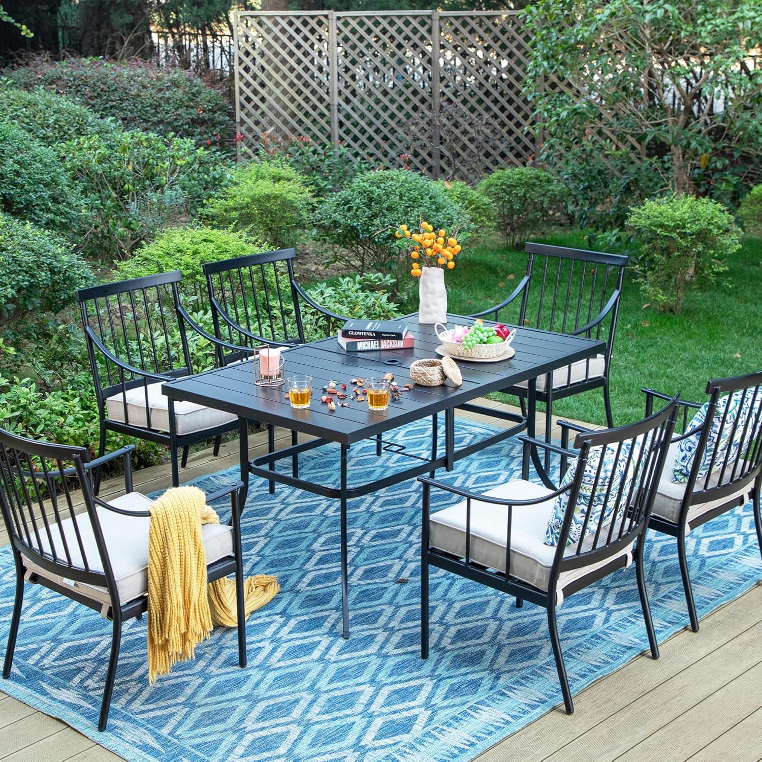 Our outdoor moments have transformed remarkably since adding this set to our porch and backyard. The spacious rectangular table comfortably accommodates six, creating a natural gathering point where everyone feels included. Its durable, rust-resistant metal surface withstands the elements, allowing us to enjoy meals and conversations without worry about wear over time. The adjustable umbrella hole is a thoughtful feature that lets us set up shade easily, enhancing comfort during sunny afternoons or light rain showers. This versatility means our gatherings extend longer into the day, no matter the weather.