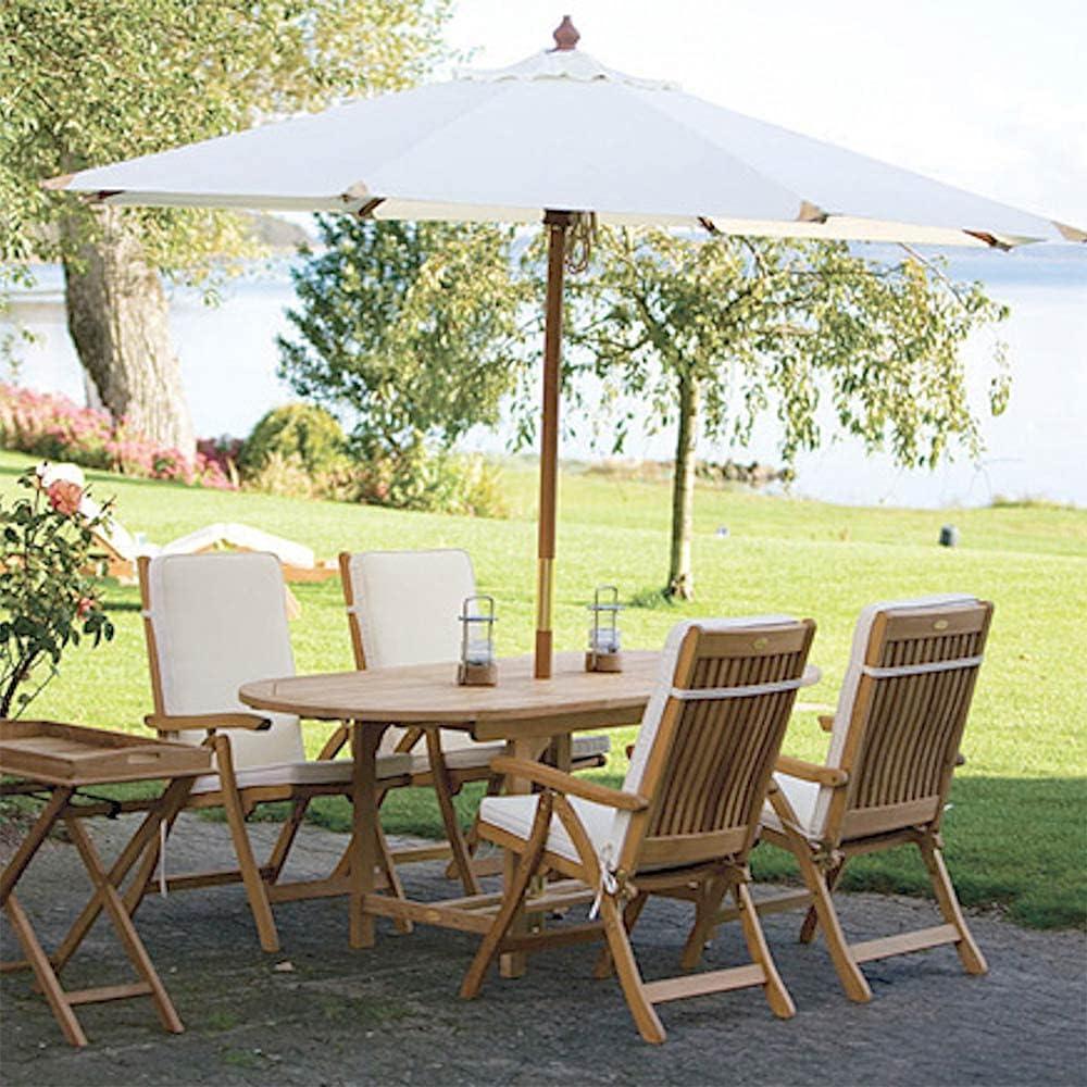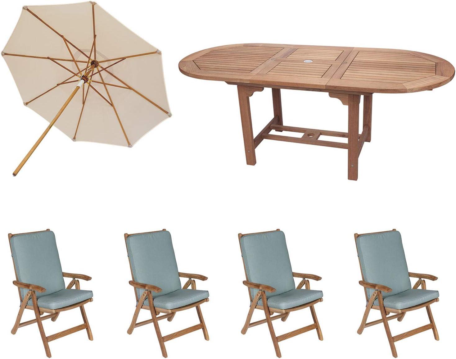 After spending some time with the 6-Piece Teak Patio Dining set with 60/78-Inch Oval Expansion Table, complete with the White Umbrella, Estate Reclining Chairs, and Spa Fullback Cushions, we gathered our thoughts on what makes this set shine – and where it leaves some room for improvement. Here’s our take: