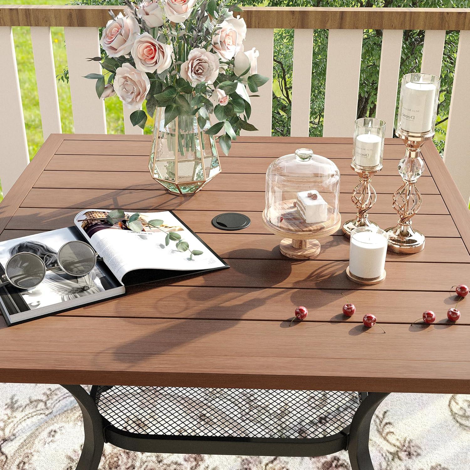 After spending considerable time using this patio dining set, we appreciate its blend of durability, style, and functionality. The rust-resistant metal frame, enhanced by electrophoresis technology, assures longevity even when exposed to outdoor elements. The table’s square design with a bent leg frame offers a blend of stability and visual appeal, making it a centerpiece for any lawn or garden setup. Additionally, the adjustable umbrella hole is a thoughtful feature that adds comfort by providing shade during sunny days. The stackable chairs are lightweight yet sturdy, allowing for easy storage without sacrificing seating comfort or support.