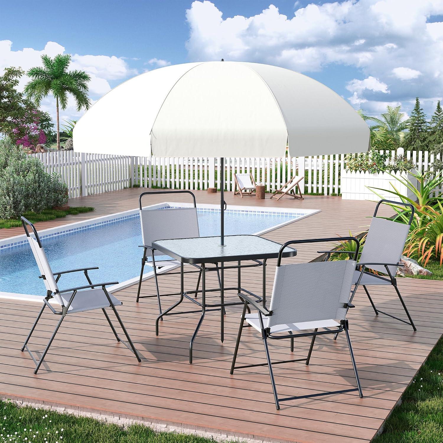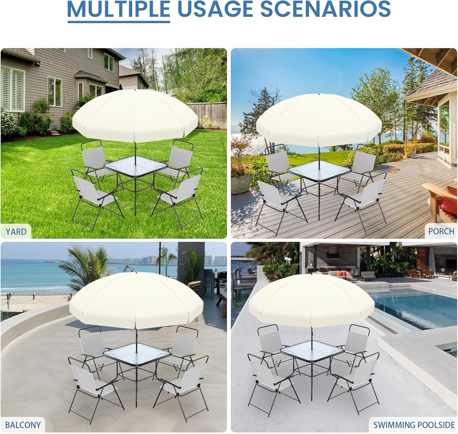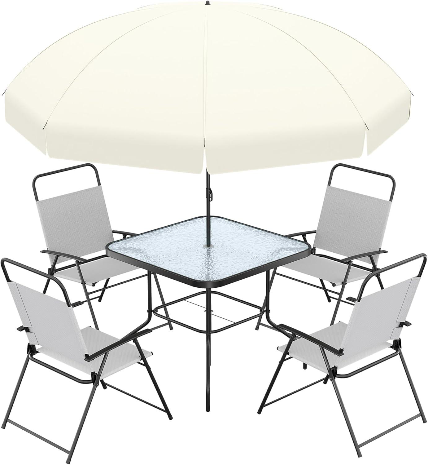 Spending time outdoors is one of our favorite ways to unwind and connect, so finding the right patio furniture is key. We recently had the chance to test the UDPATIO 6 Piece Patio Table and Chairs Set with Umbrella,designed for deck,backyard,poolside,and lawn use. With its larger tempered glass table, four folding chairs, and a convenient umbrella, this set promises both style and practicality. Over the past few weeks, we put it through its paces to see how it holds up in everyday outdoor living – from casual meals to lazy afternoons in the sun or shade. Here’s what we discovered about its quality, comfort, and ease of use.