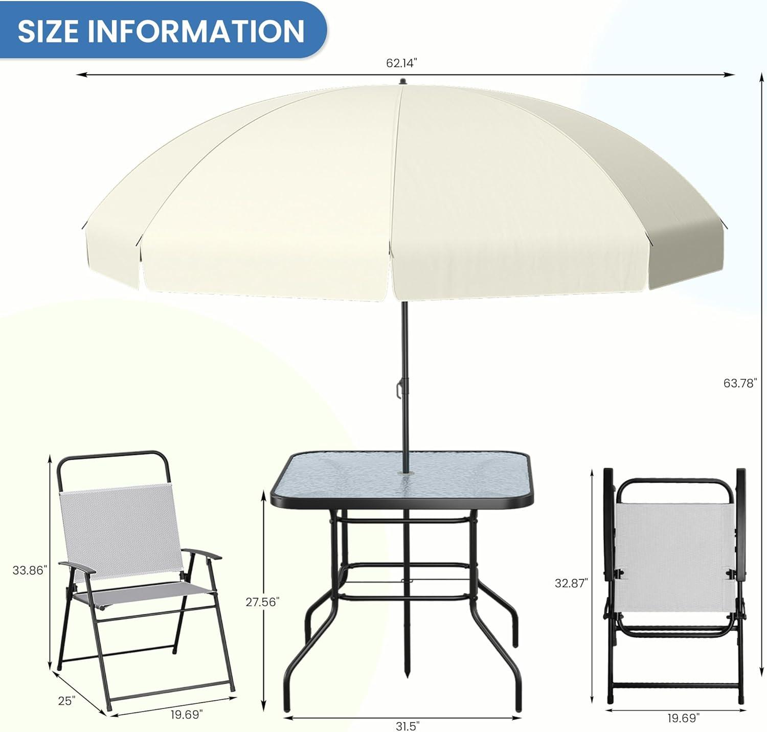 The folding chairs complement the table beautifully, featuring breathable textilene fabric wrapped around a sturdy steel frame. Their foldable design means they’re easy to store or transport whenever needed, adding great versatility especially for those spontaneous trips or extra guests during outdoor events. Plus, the included 5.2 ft umbrella with a simple lever mechanism adds an extra layer of protection from sun and rain, elevating comfort without compromising the set’s sleek profile.This umbrella can be conveniently detached and stored, keeping your space neat when it’s not in use.