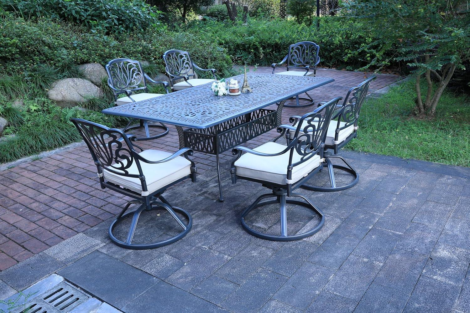 After spending ample time with this dining set,we can confidently say it strikes an excellent balance between style,comfort,and durability. The rust-resistant aluminum frame ensures it withstands various weather conditions, making it a reliable choice for outdoor spaces year-round. The six swivel rocker chairs with plush, quick-dry cushions enhance relaxation, whether you’re hosting lively gatherings or enjoying peaceful mornings. The spacious rectangular table comfortably accommodates everyone, and the umbrella hole adds thoughtful functionality for sun protection. This set transforms any patio or garden area into a cozy, elegant retreat.
