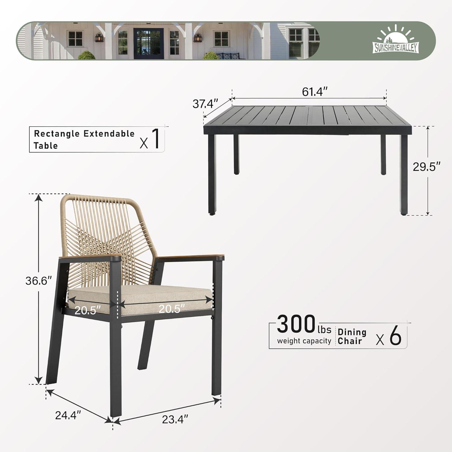 - 【7-Piece Dining Chair Set】This patio dining set contains 1 extended dining table and 6 ergonomic dining chairs. This modern outdoor dining table set features aesthetic appeal that seamlessly blends with various outdoor settings, adding charm and elegance to your patio or garden, which is perfect for your family events.