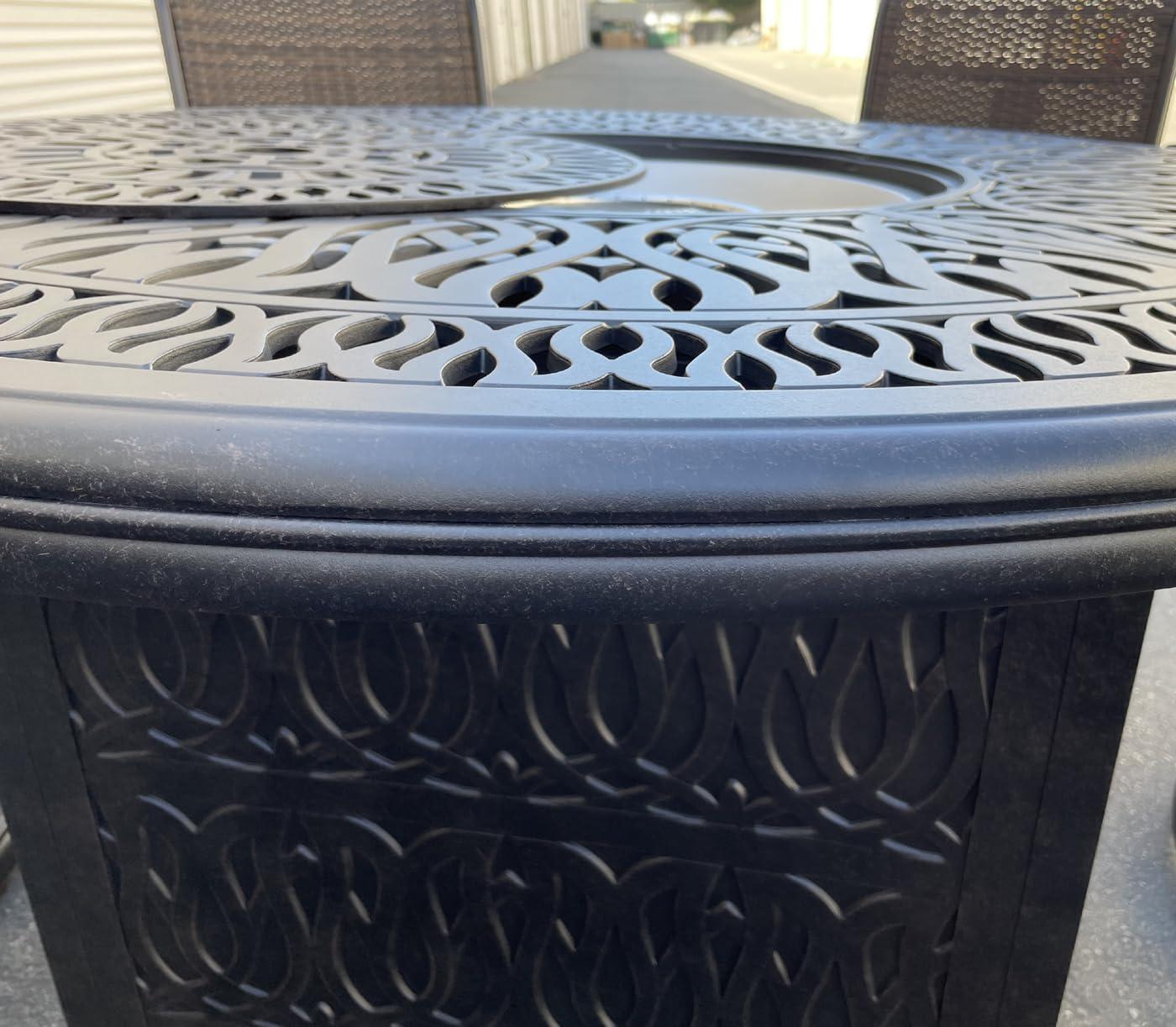 From the moment we set this dining set up, it was clear that durability and style were front and center. Crafted from cast aluminum, the entire ensemble boasts a rust-free construction, giving us confidence that it will hold up through various weather conditions without compromising on its sleek appeal.The antique desert bronze finish adds a warm, complex touch to any outdoor space, seamlessly blending with both modern and traditional patio decors. The centerpiece fire pit table, measuring 52 inches in diameter and standing 29 inches tall, offers not only a cozy ambiance but also a sturdy surface perfect for dining or casual gatherings.