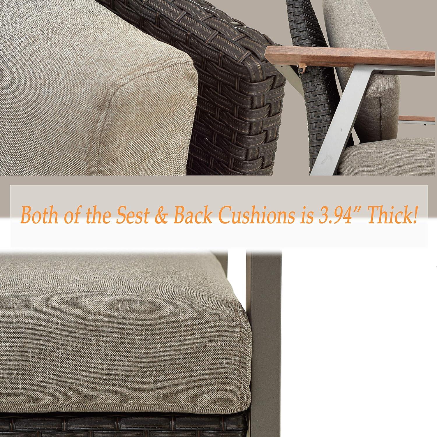 • 【UPGRADED】① Wider 26 in seat & Thicker 5 in cushion, (industry standard 24 in & 5 in); ② Reinforced Structure, Hurricane-grade steel frame with thickened support beams; ③High-end a luminum with heat treatment wood grain coating, more fashionable and reduce the metal heat in summer, protect the skin; ④Top Olefin fabric, easy to clean, ten years without fading