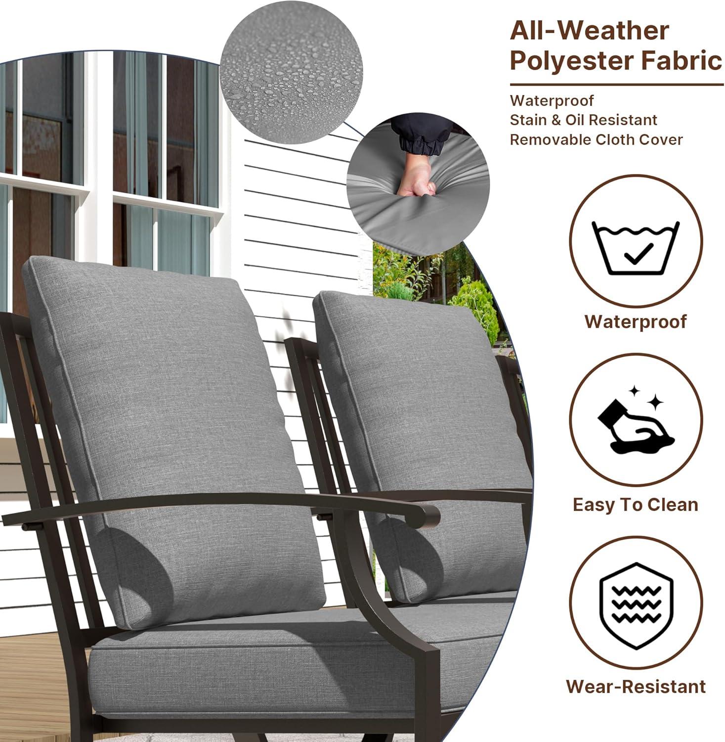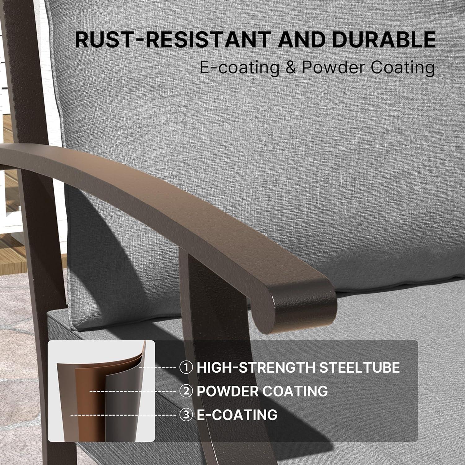 We’ve been impressed by the robust construction of this outdoor dining set, especially its high-quality metal frame with rust-resistant powder coating.This coating not only protects against moisture but also provides excellent resistance to UV rays, helping the furniture maintain its sleek gray finish without fading, even under harsh sun exposure. Whether it’s scorching summer afternoons or drizzly autumn evenings, the set stands strong, making it a reliable choice for year-round enjoyment. Plus, the waterproof cushions add an extra layer of resilience, keeping comfort intact even after unexpected showers.