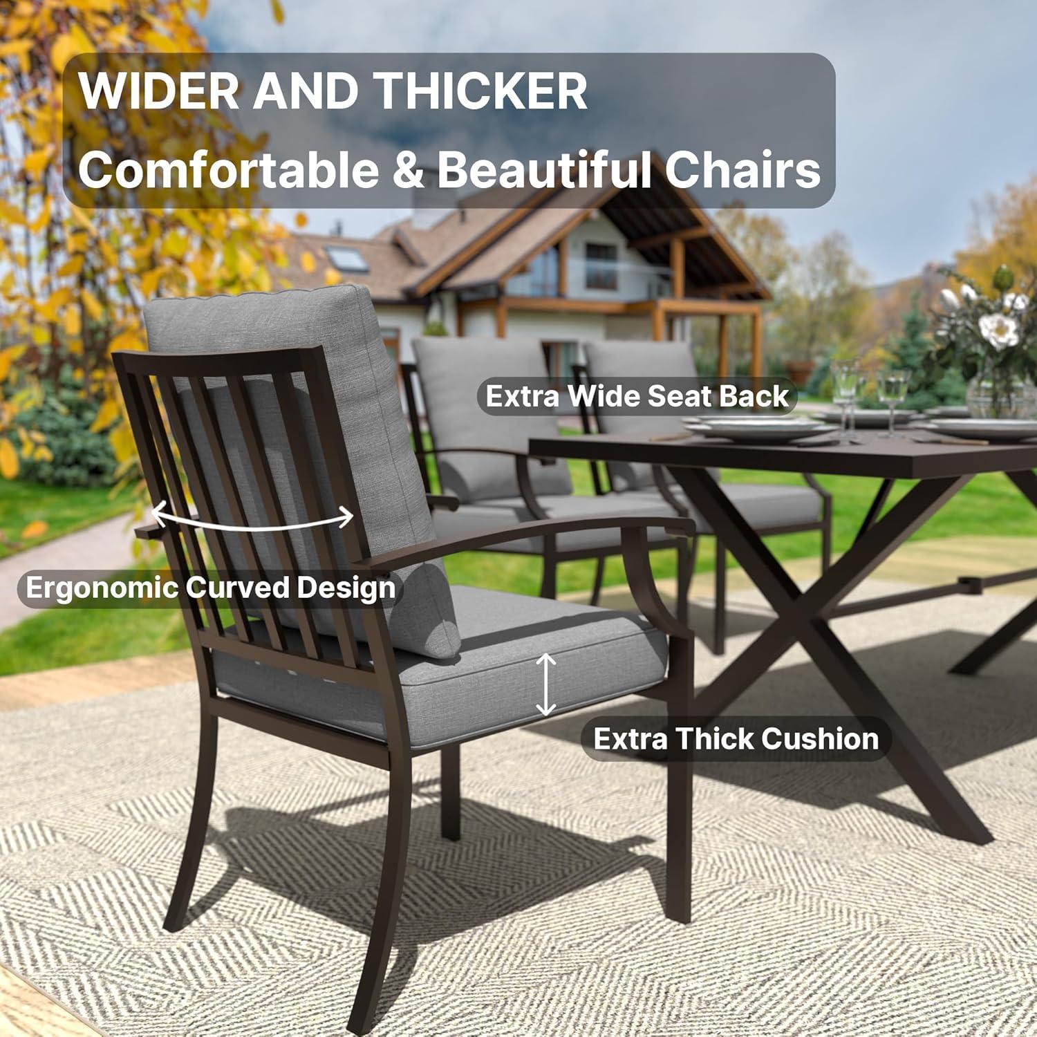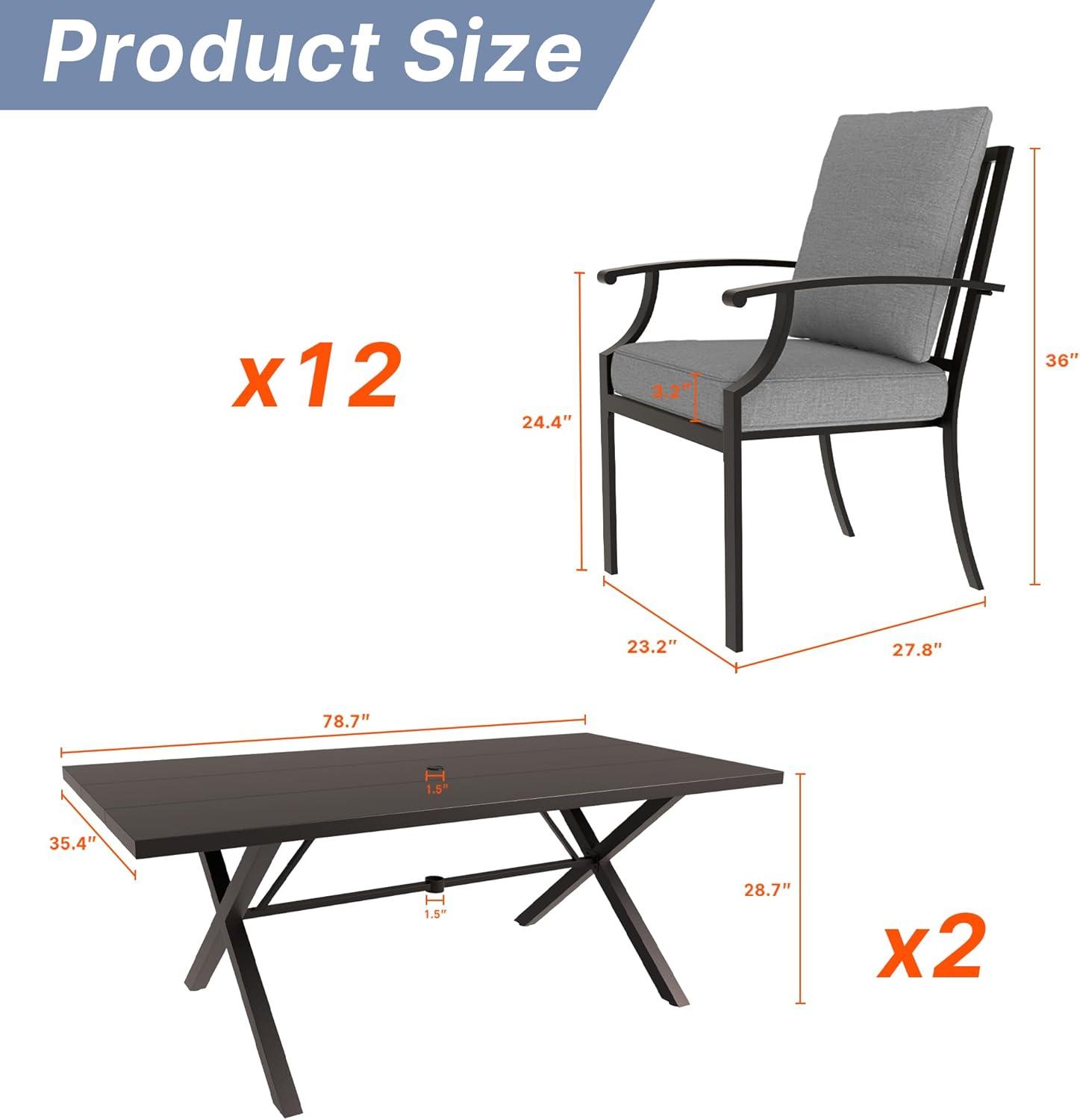 Our experience with this outdoor dining ensemble highlights its thoughtful and user-friendly design,perfectly suited for gatherings on the deck or patio. The 12 straight-backed metallic chairs feature curved armrests and backs that bring an unexpected level of comfort to metal seating. paired with cushions that are 3.2 inches thick and made from high-quality, elastic cotton foam, sitting for extended periods feels soft and supportive. The cushions come equipped with velcro to keep them securely in place, while their waterproof and fade-resistant fabric covers unzip easily for hassle-free cleaning.