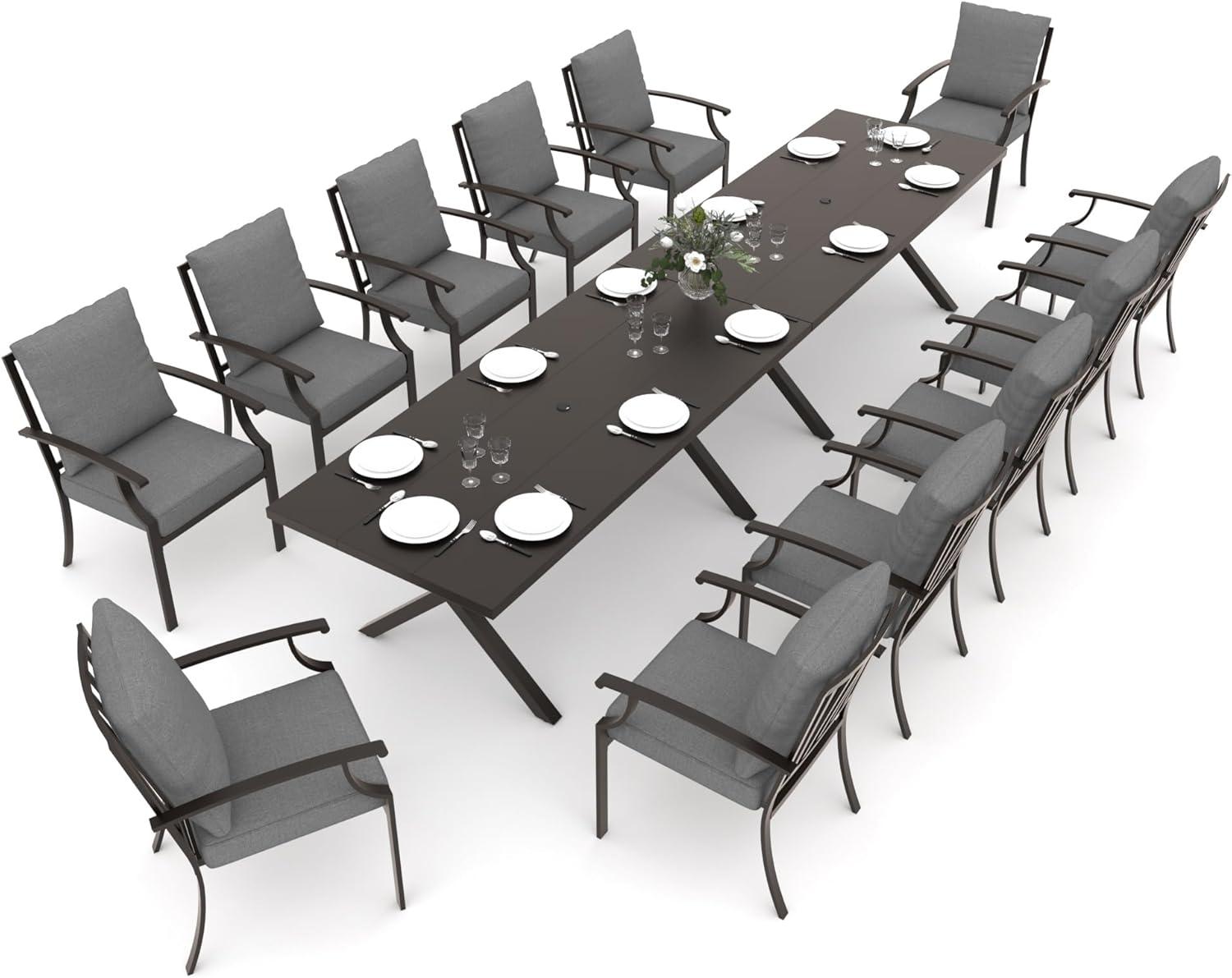 This dining set is an excellent fit for those who frequently entertain outdoors and need ample seating without compromising comfort.With 12 straight-backed metallic chairs featuring ergonomic curved armrests and backs, plus thick 3.2-inch cushions that stay securely in place thanks to Velcro attachments, it’s perfect for large families or hosting garden parties. Its weather-resistant frame and waterproof, fade-resistant fabric mean it thrives in diverse climates, ideal for decks, patios, or covered porches where durability is a must.