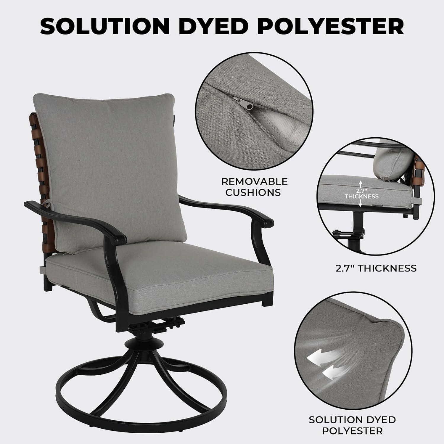We found the swivel chairs incredibly comfortable for daily outdoor dining and lounging,thanks to their 360-degree rotation and gentle rocking motion. The wide faux leather straps not only look stylish but also provide sturdy support without the need for constant upkeep. The cushions, filled with thick foam and covered in solution-dyed polyester fabric, resisted stains, rain, and sun exposure remarkably well. cleaning was a breeze since the cushions are zippered and removable, allowing us to maintain a fresh and inviting seating area easily. The table’s built-in umbrella hole was a practical touch, letting us add shade effortlessly during sunny afternoons.