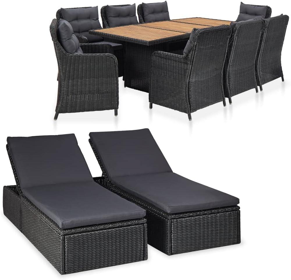 Upon unboxing this 11-piece patio dining arrangement, we were promptly drawn to its sleek, modern design, highlighted by the elegant interplay of black poly rattan and the warm, natural hues of solid acacia wood. The robust steel frame provides a reassuring sturdiness, promising durability through various weather conditions. Each chair and sunlounger comes equipped with thickly padded cushions and back pillows, covered in removable, zippered polyester covers – a thoughtful touch that enhances comfort and ease of maintenance. The lightweight construction surprised us, making it effortless to rearrange the pieces to suit different social settings or simply to capture the sun’s best spots throughout the day.