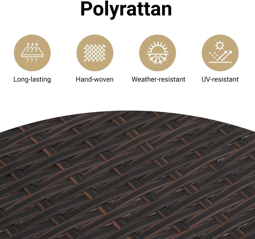 - Durability and Weather Resistance: Made from durable PE rattan wicker and a high-quality steel frame, the furniture set is built for stability and balance. The All-Weather wicker and Anti-Rust steel frame ensure the set's durability, while the breathable 250G polyester fabric is Anti-UV, water repellent, and resistant to stains.