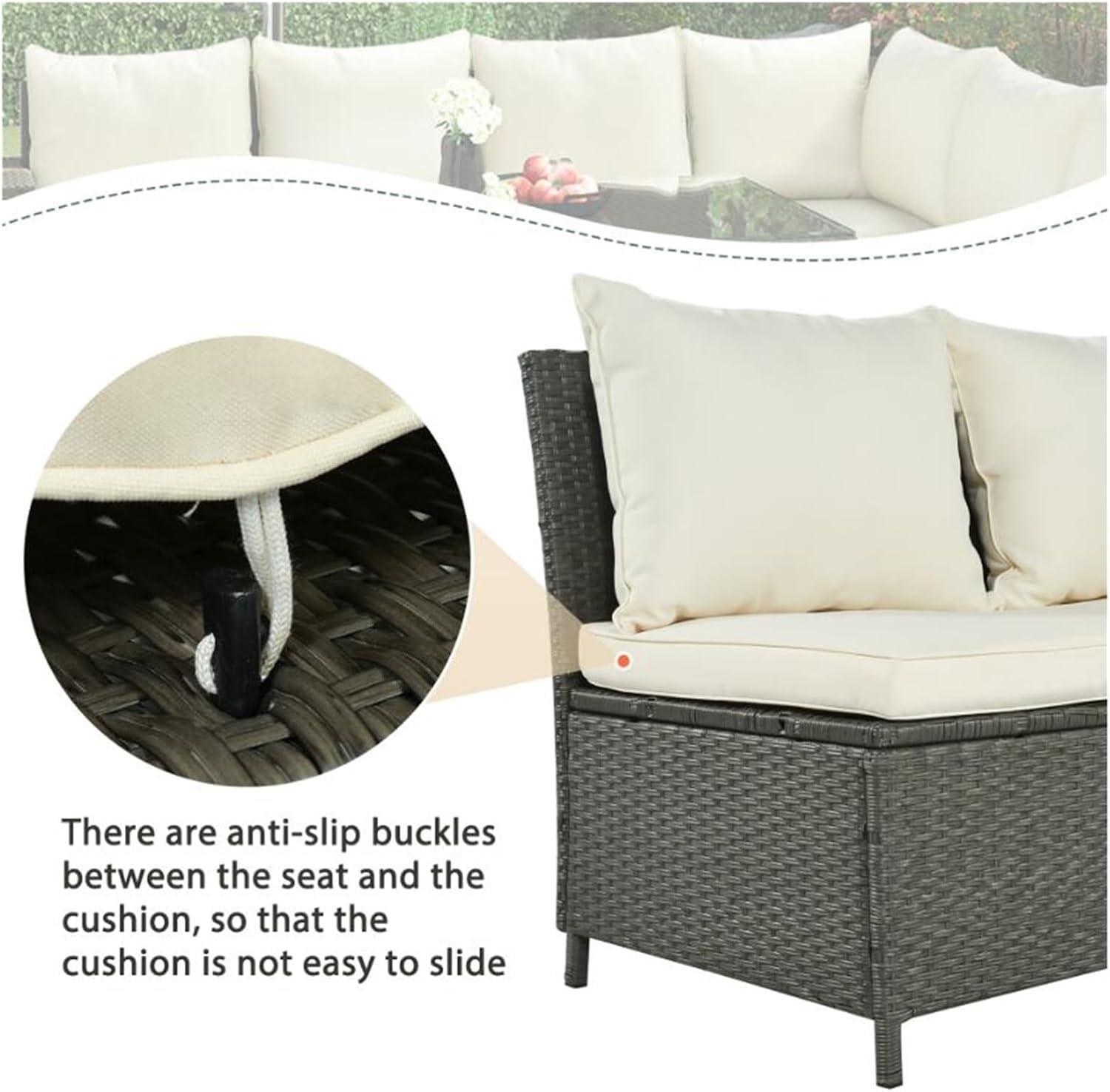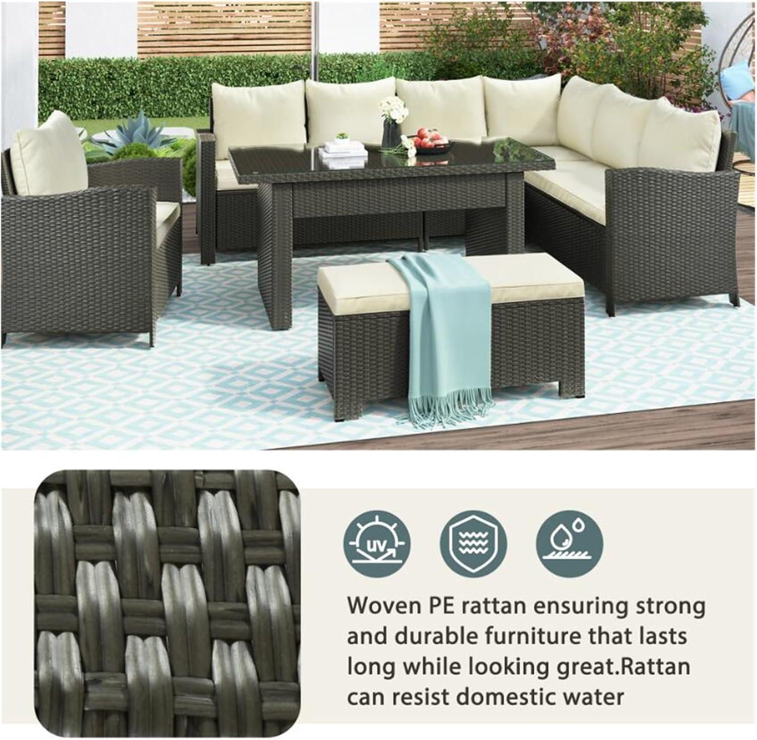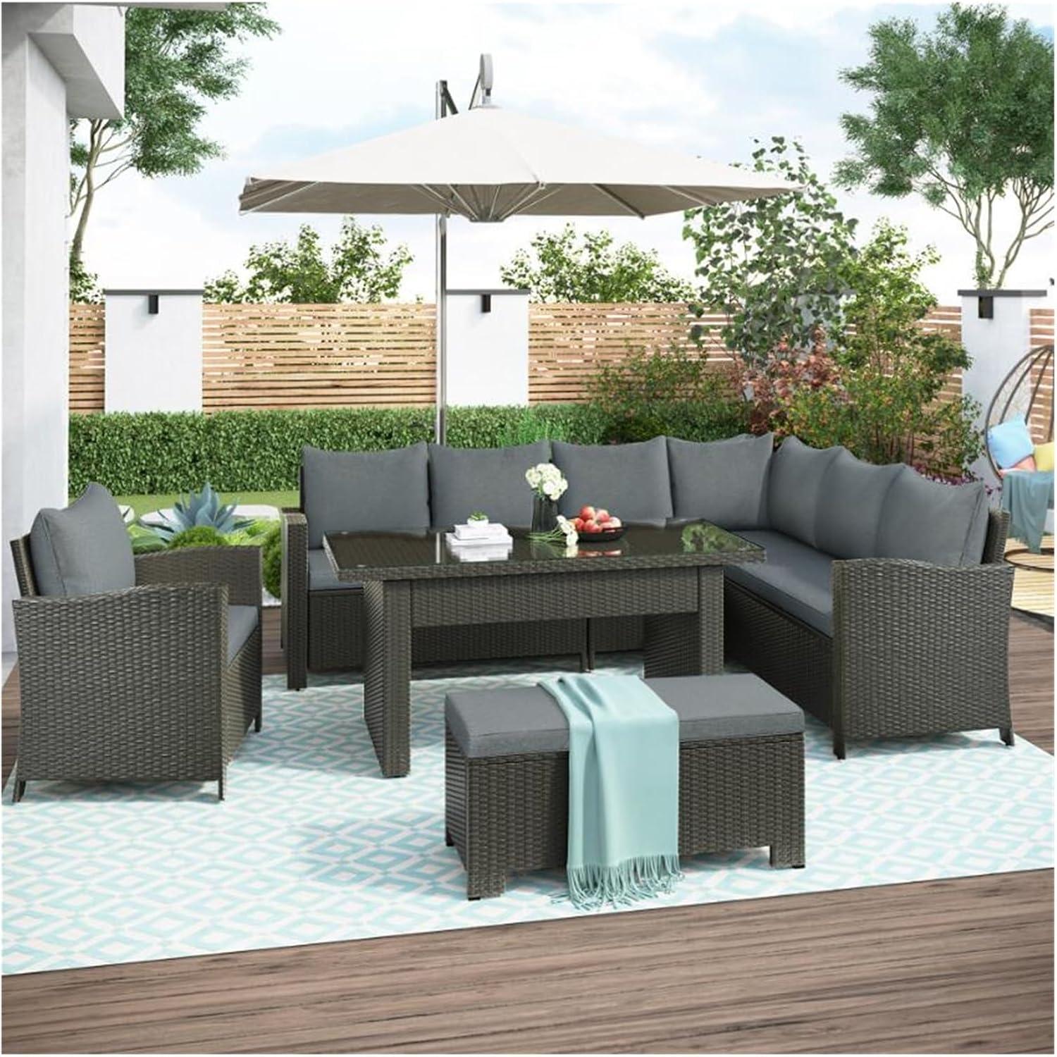 Our time with this six-piece patio furniture set has been notably pleasant, combining both style and functionality in one package. The set comfortably accommodates 7-8 people, making it perfect for gatherings on the porch, garden, or poolside. We appreciated the thoughtful inclusion of five seat cushions and eight back cushions filled with a soft polyester blend, providing excellent comfort during long conversations or casual meals. The gray wicker and rattan material paired with a sturdy galvanized iron frame not only offer durability but also a sleek, modern look that enhances our outdoor space.
