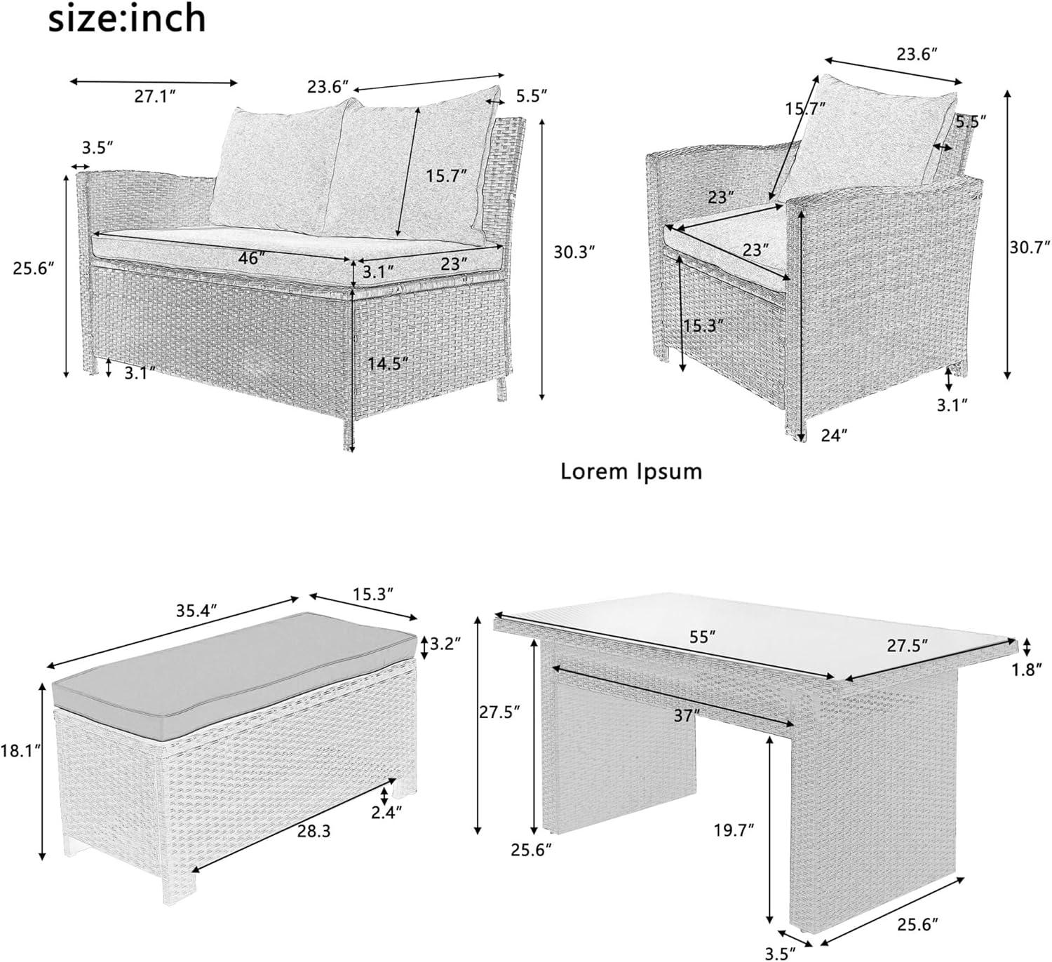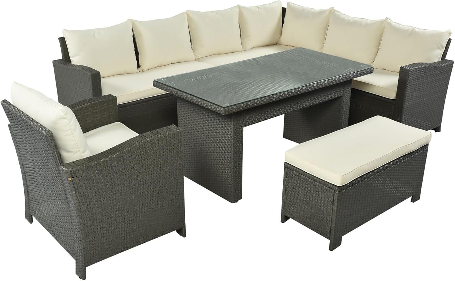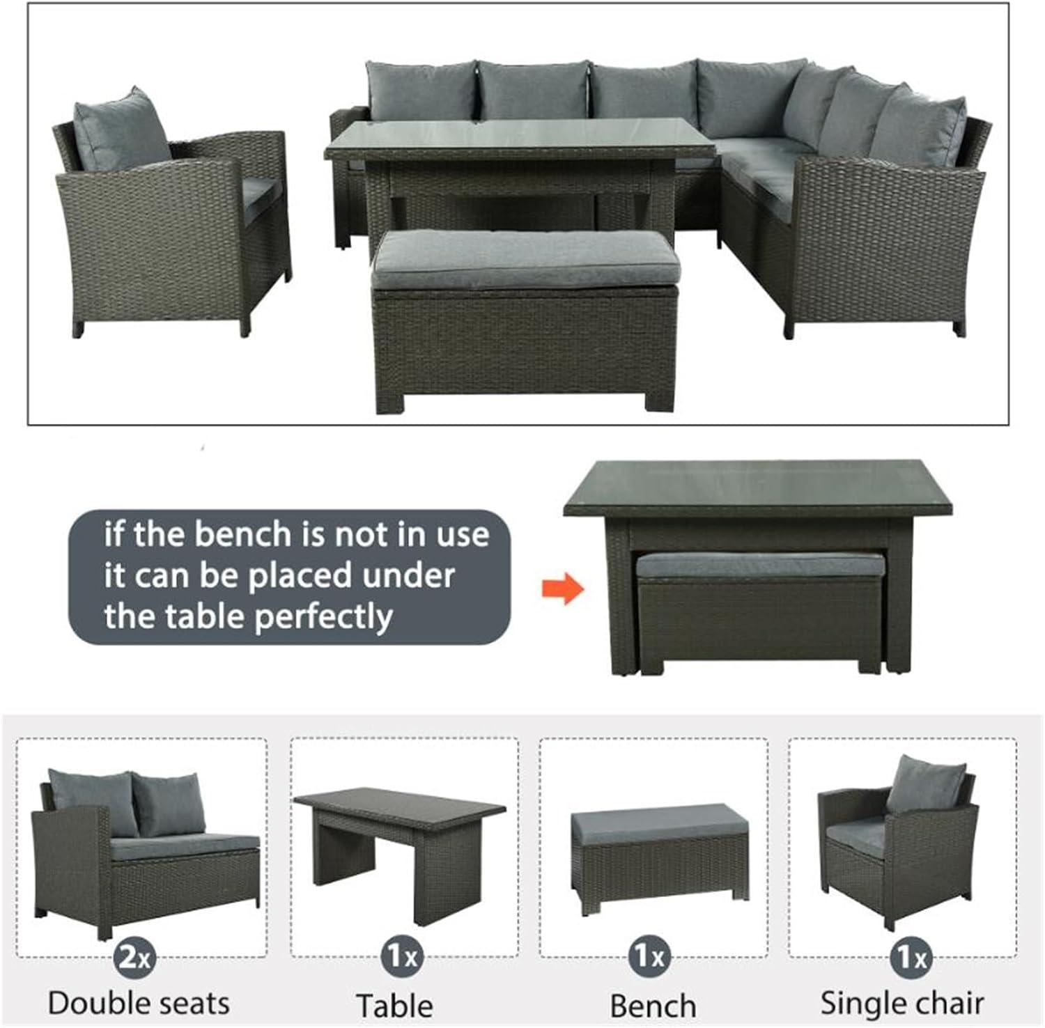 Our time with this six-piece patio furniture set has been notably pleasant, combining both style and functionality in one package. The set comfortably accommodates 7-8 people, making it perfect for gatherings on the porch, garden, or poolside. We appreciated the thoughtful inclusion of five seat cushions and eight back cushions filled with a soft polyester blend, providing excellent comfort during long conversations or casual meals. The gray wicker and rattan material paired with a sturdy galvanized iron frame not only offer durability but also a sleek, modern look that enhances our outdoor space.