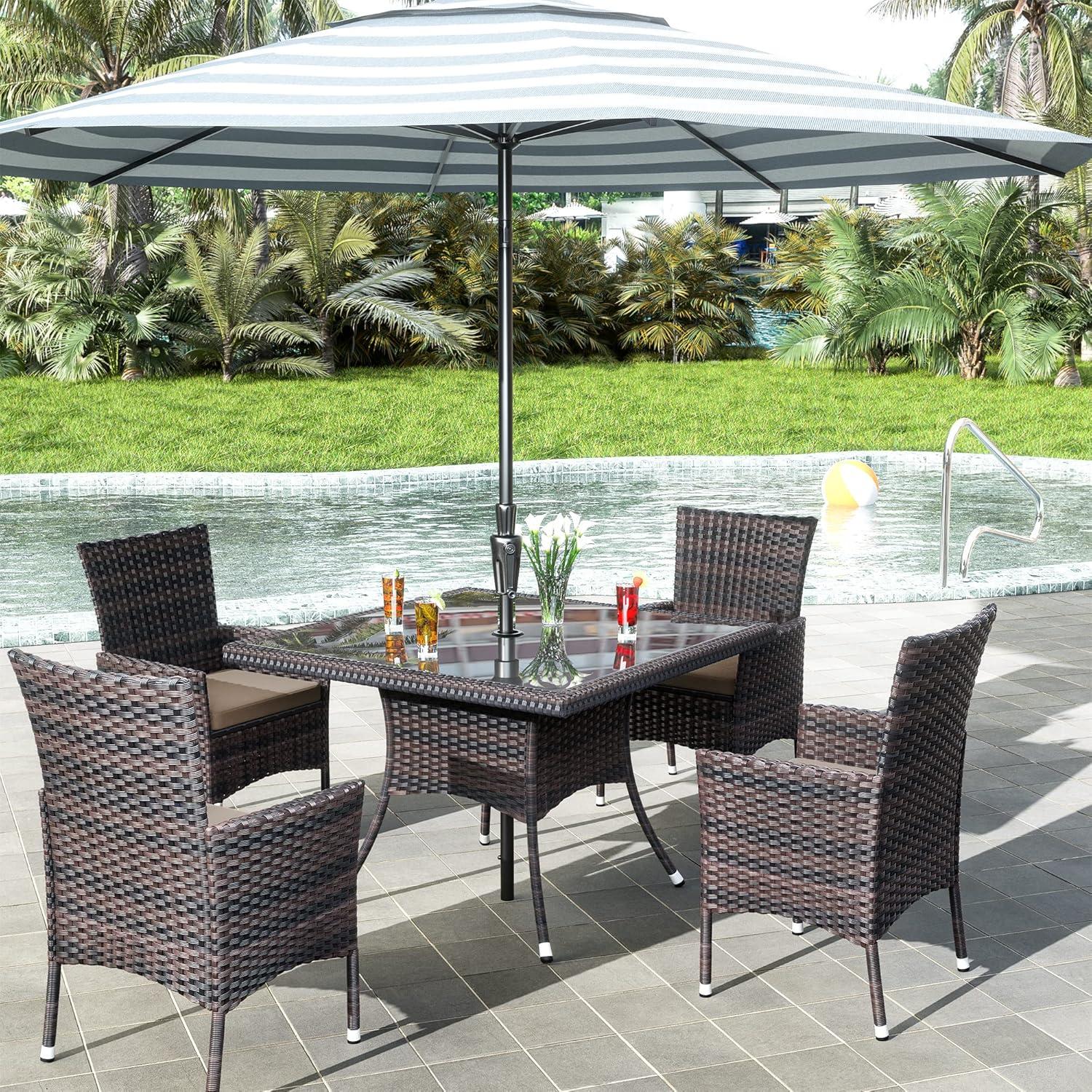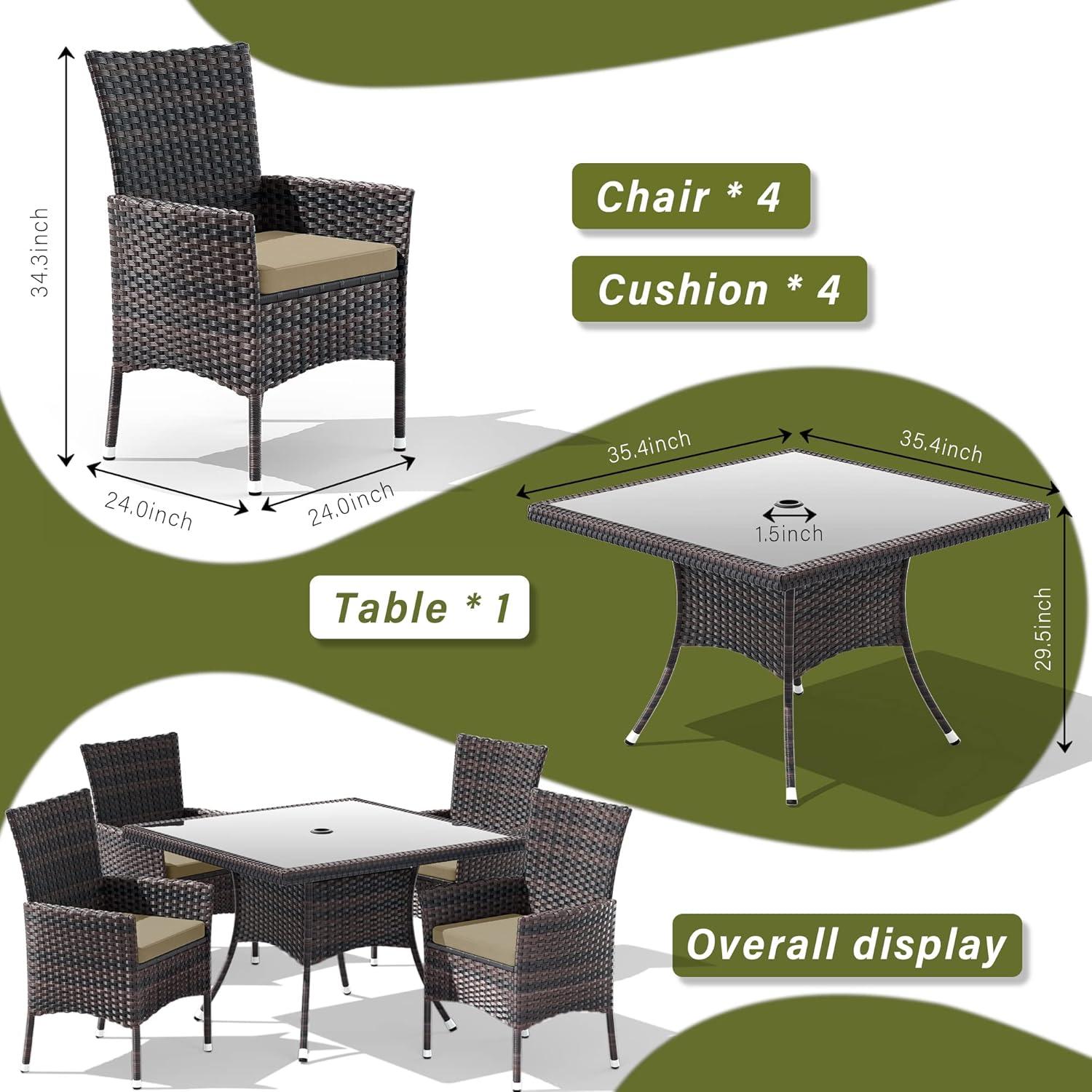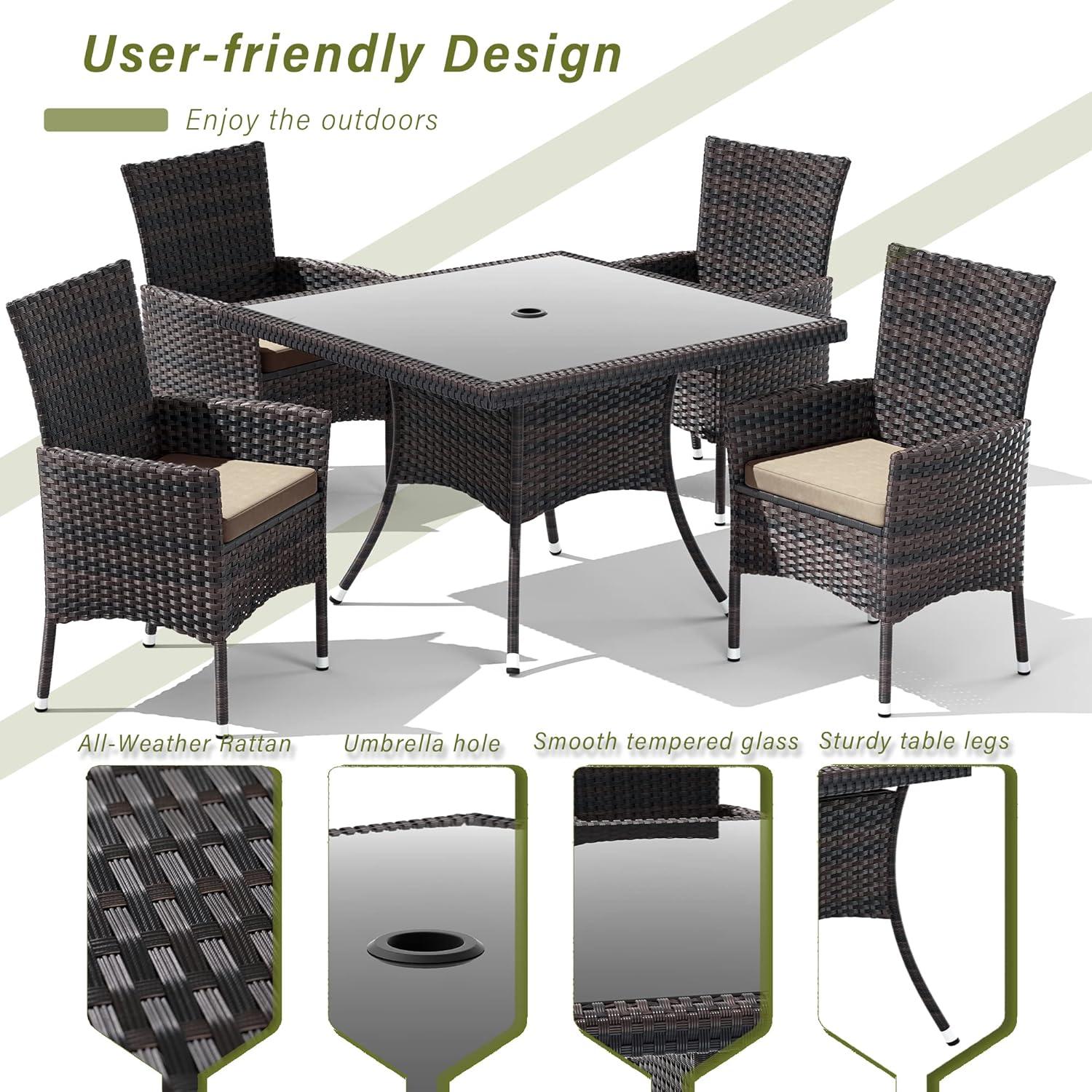 Setting up this outdoor dining set is a breeze thanks to its thoughtful design. The rust-resistant steel frame ensures sturdy support, while the handcrafted PE rattan weaves add both durability and charm. An added convenience is the table’s built-in umbrella hole-which comes with a removable cover-allowing us to easily attach shade on sunny days or keep the surface smooth when the umbrella isn’t needed. The four chairs include plush brown cushions that are perfectly sized for comfort and can be quickly placed or removed as needed. Together, these features make the assembly straightforward and the entire set instantly inviting for family dinners, casual tea parties, or simply relaxing outdoors.