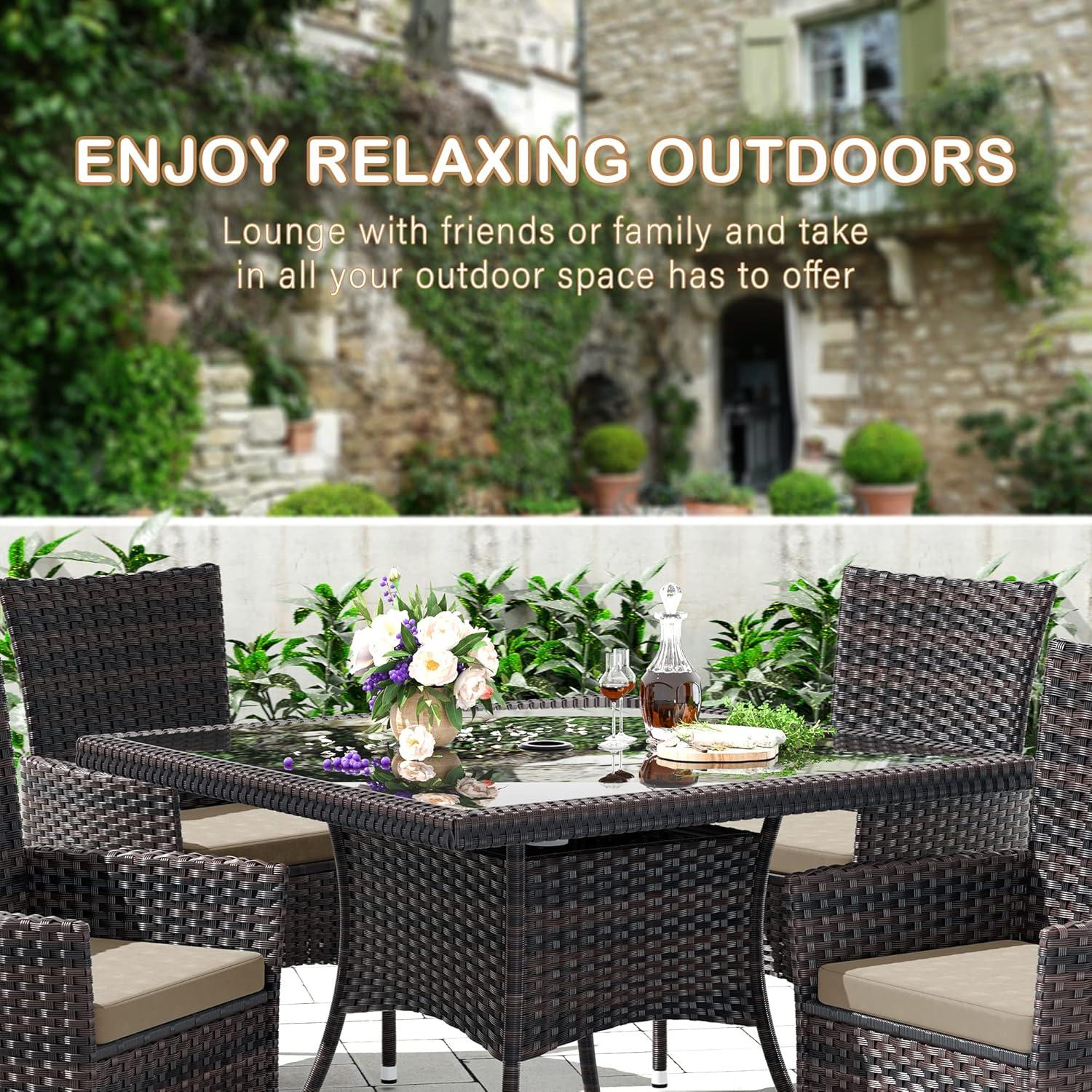 When evaluating this rattan dining set against other outdoor furniture choices, its combination of durability and style stands out promptly. Crafted from all-weather PE rattan woven over a rust-resistant steel frame, it offers a sturdier and more weatherproof option to traditional wood or metal sets that can chip, peel, or rust over time. The tempered glass tabletop not only adds elegance but also simplifies maintenance-smudges and spills wipe away effortlessly compared to porous surfaces found in some wooden or stone tables. The addition of removable brown cushions enhances comfort without sacrificing easy cleaning, making this set highly practical for everyday use and seasonal gatherings alike.