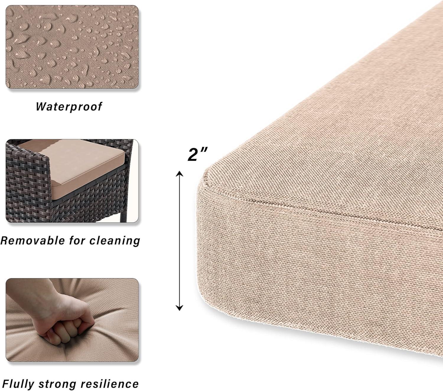 From a style outlook, the cushions’ warm brown hue beautifully complements the rich, weather-resistant PE rattan, creating a cohesive and sophisticated look. This natural tone blends seamlessly with outdoor surroundings, while adding a touch of elegance to our patio setup. They’re versatile enough to blend into varied décor themes and don’t overpower the overall aesthetic. Here’s a quick snapshot of their key qualities: