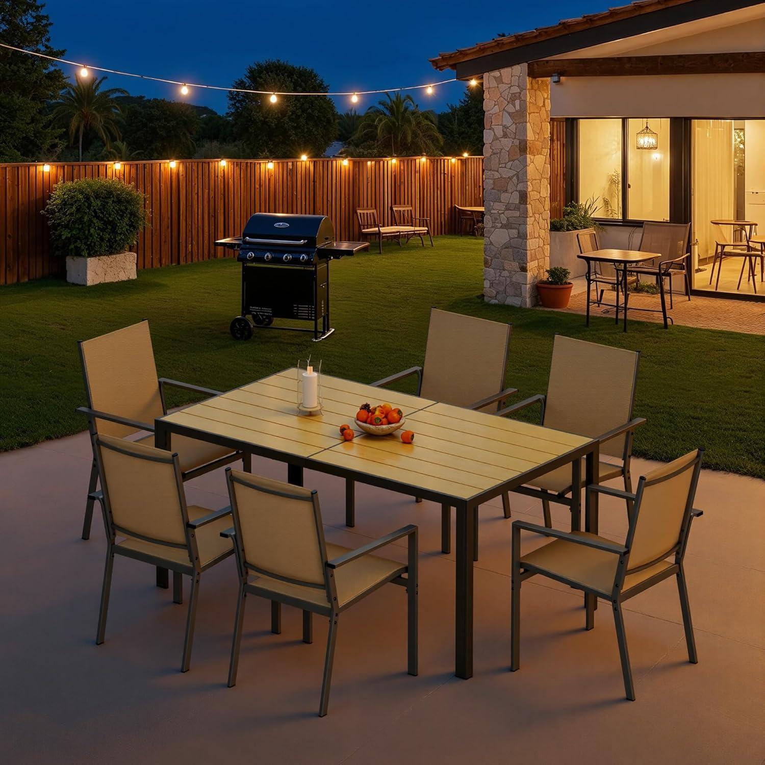 - 【7-Piece Dining Chair Set】This patio dining set contains 1 extended dining table and 6 ergonomic dining chairs. This modern outdoor dining table set features aesthetic appeal that seamlessly blends with various outdoor settings, adding charm and elegance to your patio or garden, which is perfect for your family events.