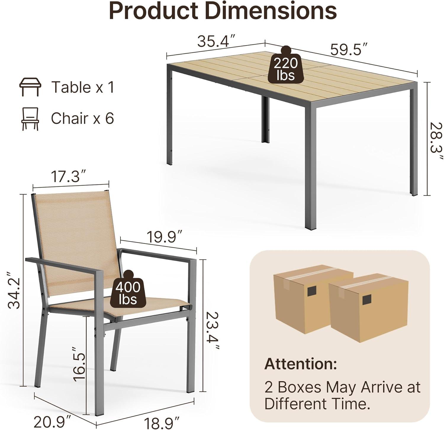 After spending quality time with this patio dining set, we appreciate its thoughtful blend of durability, comfort, and style that truly elevates outdoor gatherings. The steel frame and double-layer construction guarantee solid stability, while the weather-resistant wood grain tabletop adds a textured warmth to any backyard or poolside setting. The Textilene fabric chairs stand out for their breathability and quick-drying properties, making them perfect for both sunny and rainy days without fading or stains. Plus, the stackable design of the six chairs is a clever space-saving feature that we found incredibly practical for hosting larger groups or for easy storage.
