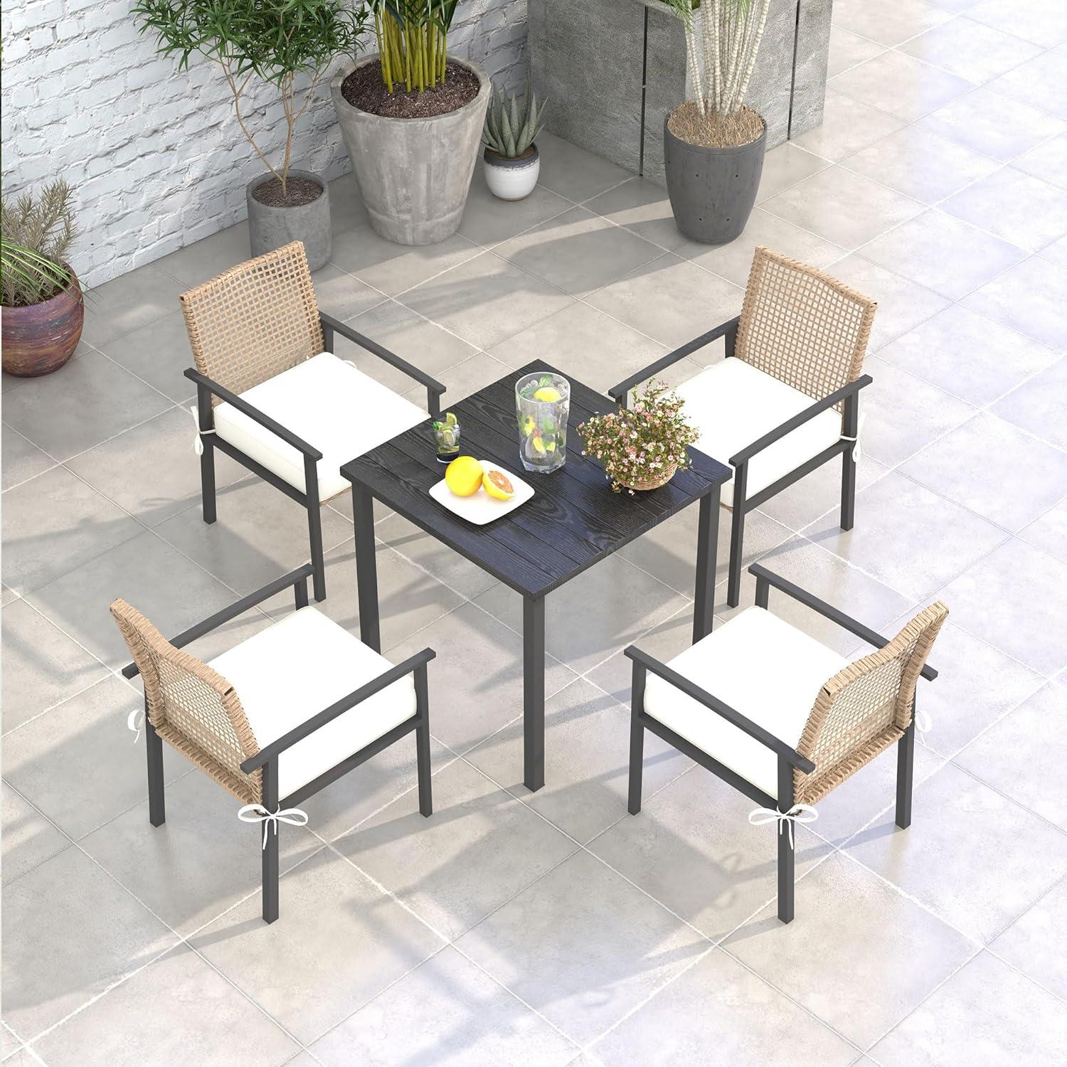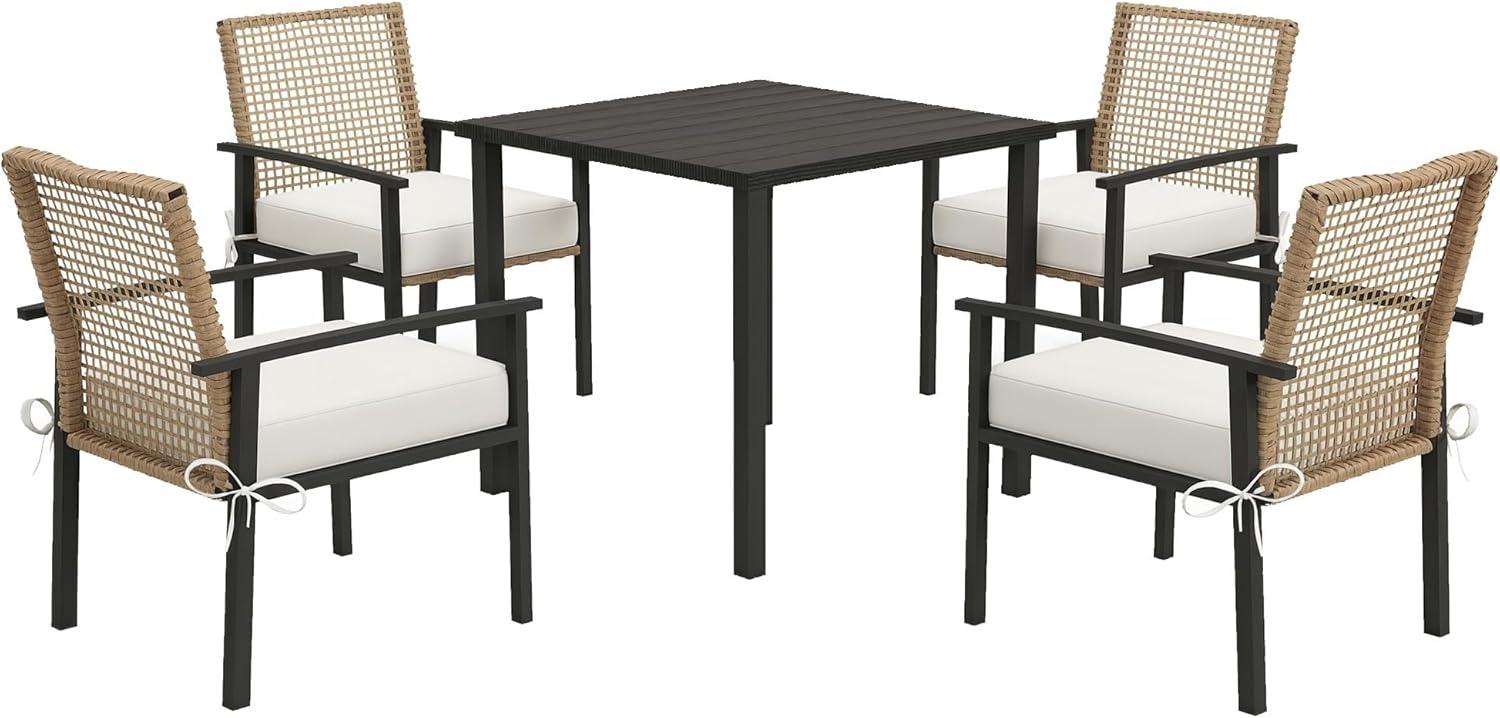 We found this outdoor dining set to be a charming blend of functionality and style, ideal for enhancing any patio, garden, or backyard space.The set includes four chairs complemented by soft, padded cushions that not only add comfort but also feature breathable woven backrests and armrests, making long conversations or meals much more enjoyable. the square table offers a sturdy outdoor hub with a wood-grain style metal top that’s easy to clean, perfect for everything from casual dining to playing board games with friends. The steel frame is powder-coated, providing both durability and a water-safe design that stands up well to the elements.