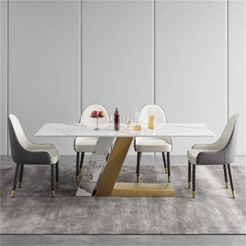 The material quality of the table beautifully combines aesthetic elegance with robust functionality.The sintered stone surface boasts a pristine white finish that holds up against stains and scratches, making it a perfect choice for modern dining environments. Complementing the tabletop are the golden metal legs, which not only enhance the luxurious feel but also contribute substantially to the sturdy build. This blend of materials results in a piece that offers both long-lasting performance and striking visual appeal, truly elevating any dining space.