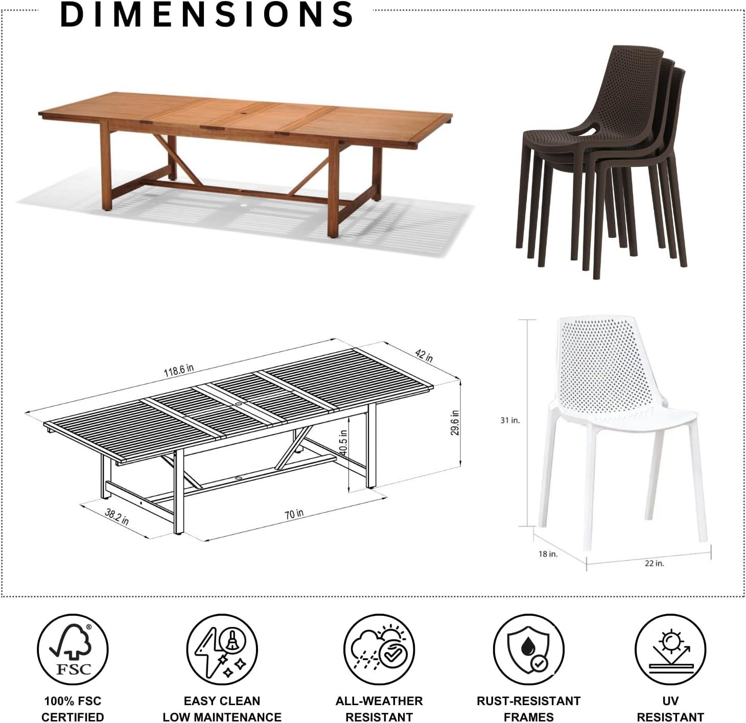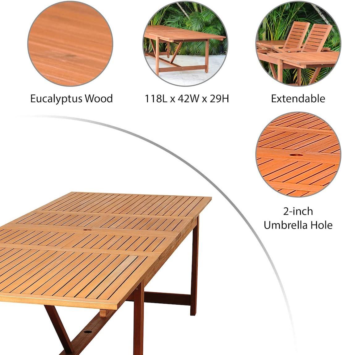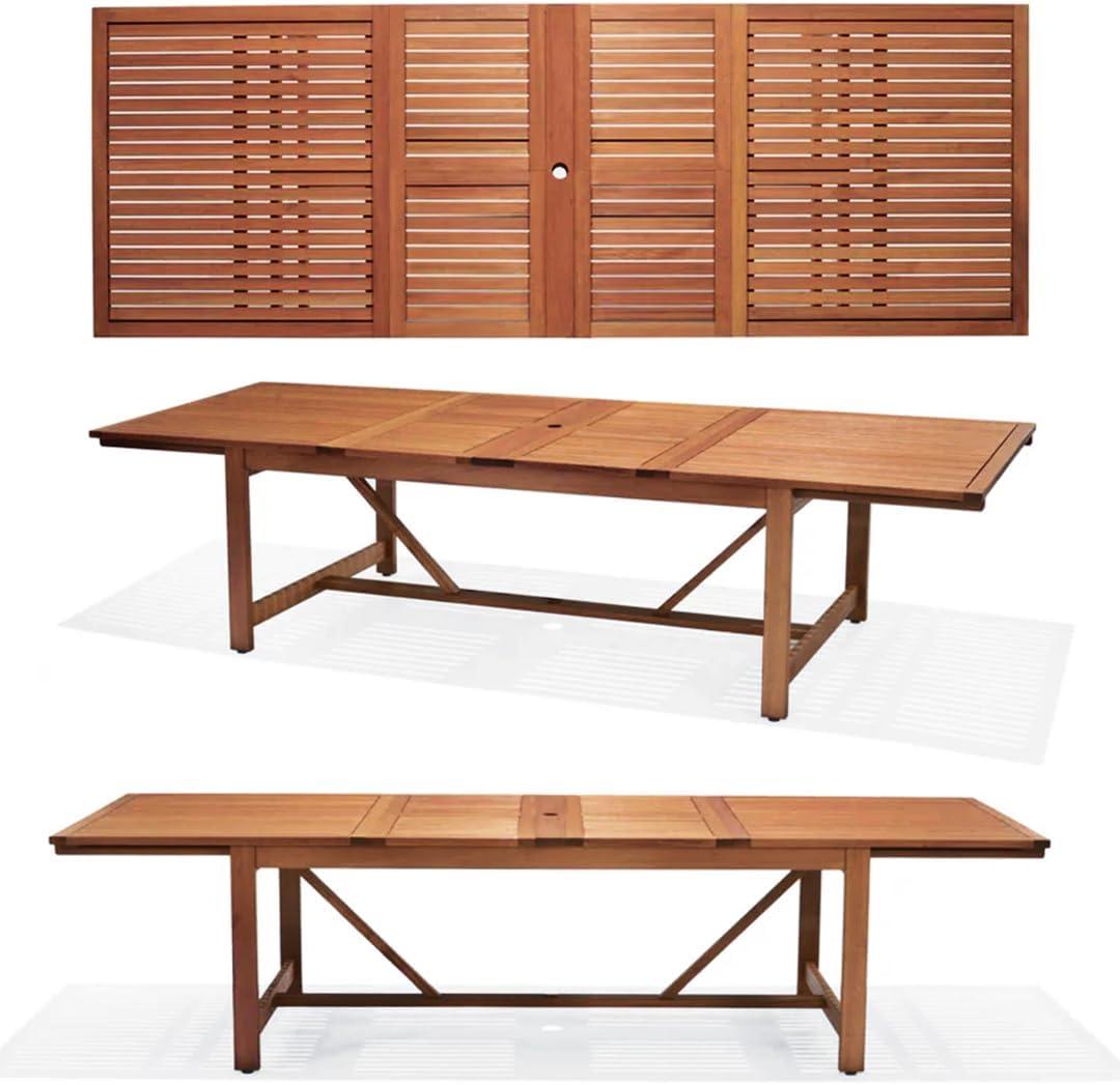Crafted from 100% FSC eucalyptus wood, the set offers durability and weather resistance ideal for any outdoor surroundings. The smooth finish and warm brown tone bring a natural elegance that complements both modern and classic patio settings.We appreciate how the extendable rectangular table adapts effortlessly from 70″ to 118″ in length, allowing us to host everything from intimate dinners to larger gatherings without sacrificing comfort or space. The built-in 2-inch umbrella hole adds convenience, letting us enjoy shade whenever needed, while the leveling legs give perfect stability on uneven surfaces.