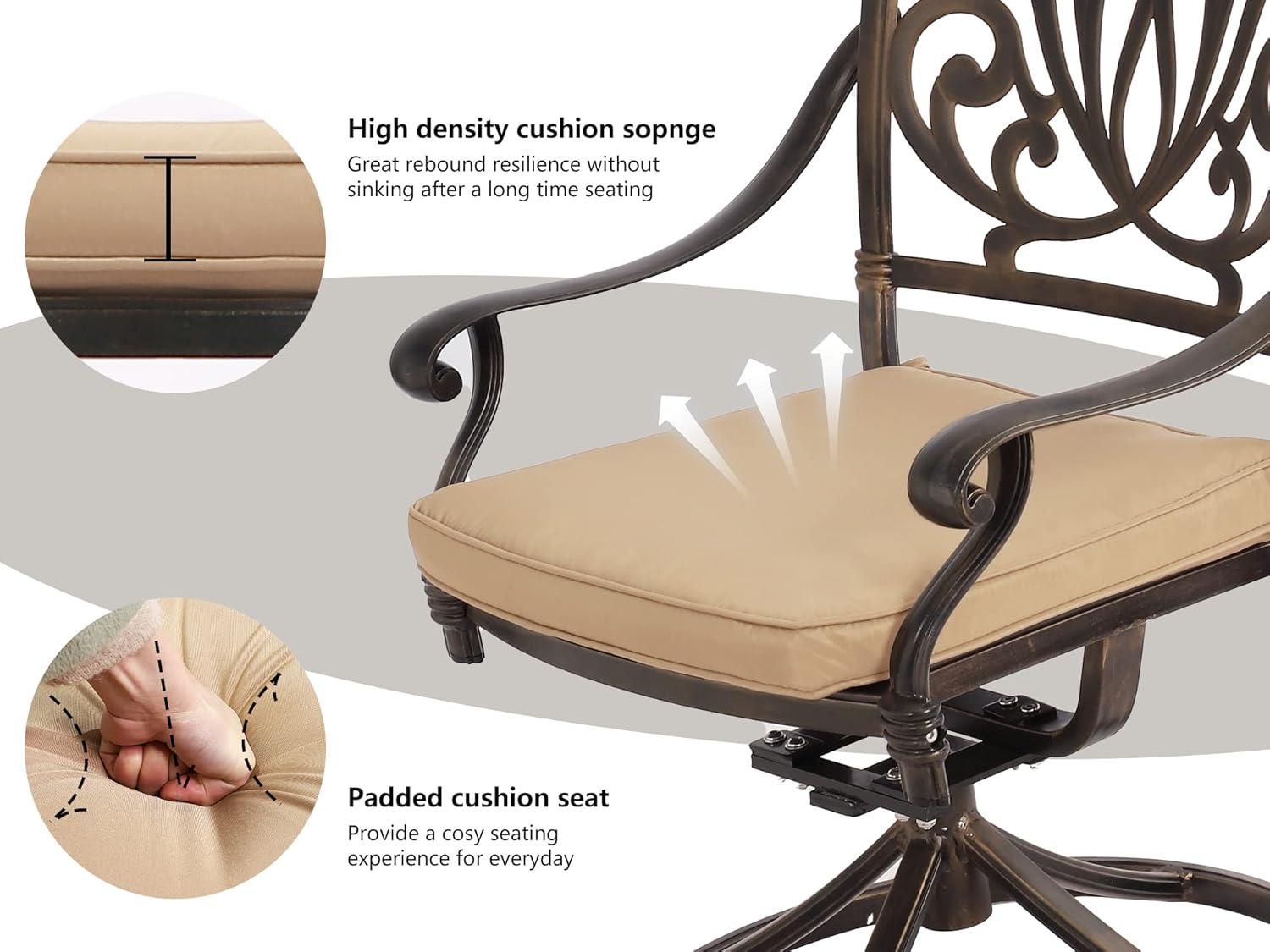 Crafted with a sturdy cast aluminum frame, this outdoor dining set immediately impresses with its robust construction and attention to ergonomic details. The smooth curves of the armrests and the well-ventilated design of the seats enhance comfort during long hours spent outdoors. The chairs boast a 360-degree swivel feature combined with a gentle rocking motion, allowing us to relax in any position without restriction. Notably,the cushions are UV-treated and fade-resistant,complete with convenient zippers for easy removal and cleaning,ensuring they maintain their vibrant khaki color season after season. Even without cushions, the chairs function perfectly, offering flexibility and durability for various weather conditions.
