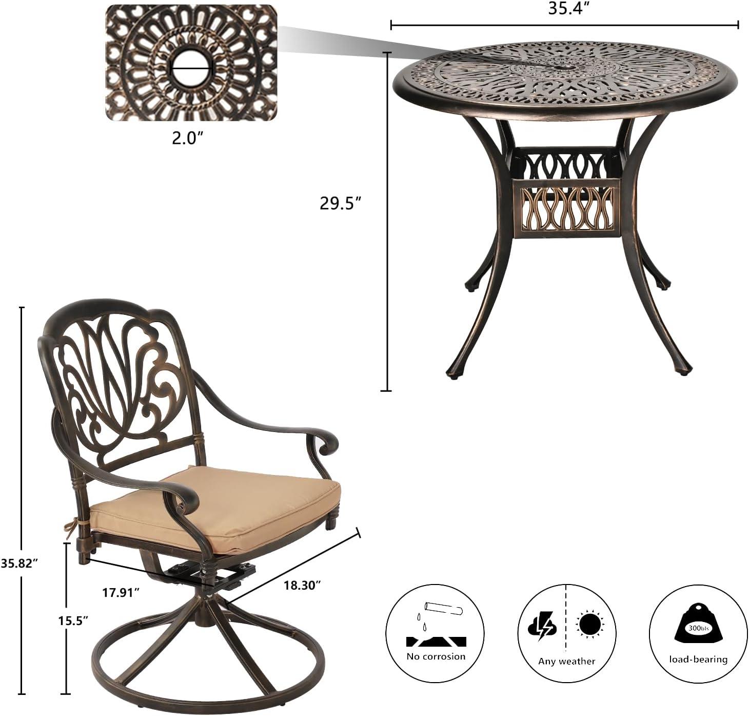 This outdoor dining set impresses us with its thoughtful blend of style, durability, and comfort. The cast aluminum frame provides a sturdy yet lightweight foundation that stands up well to outdoor elements, while the 360-degree swivel rocker chairs offer an inviting mix of relaxation and practicality. The removable, UV-treated cushions are a particularly nice touch, balancing comfort and easy maintenance while ensuring the swivel chairs stay fresh and vibrant through the seasons. Plus, the built-in umbrella hole adds versatility, making it easy to create a shaded, cool spot during sunny days.Its moderate size fits well in various outdoor areas, whether it’s a townhouse patio or a spacious garden nook.