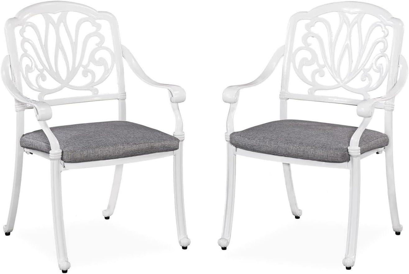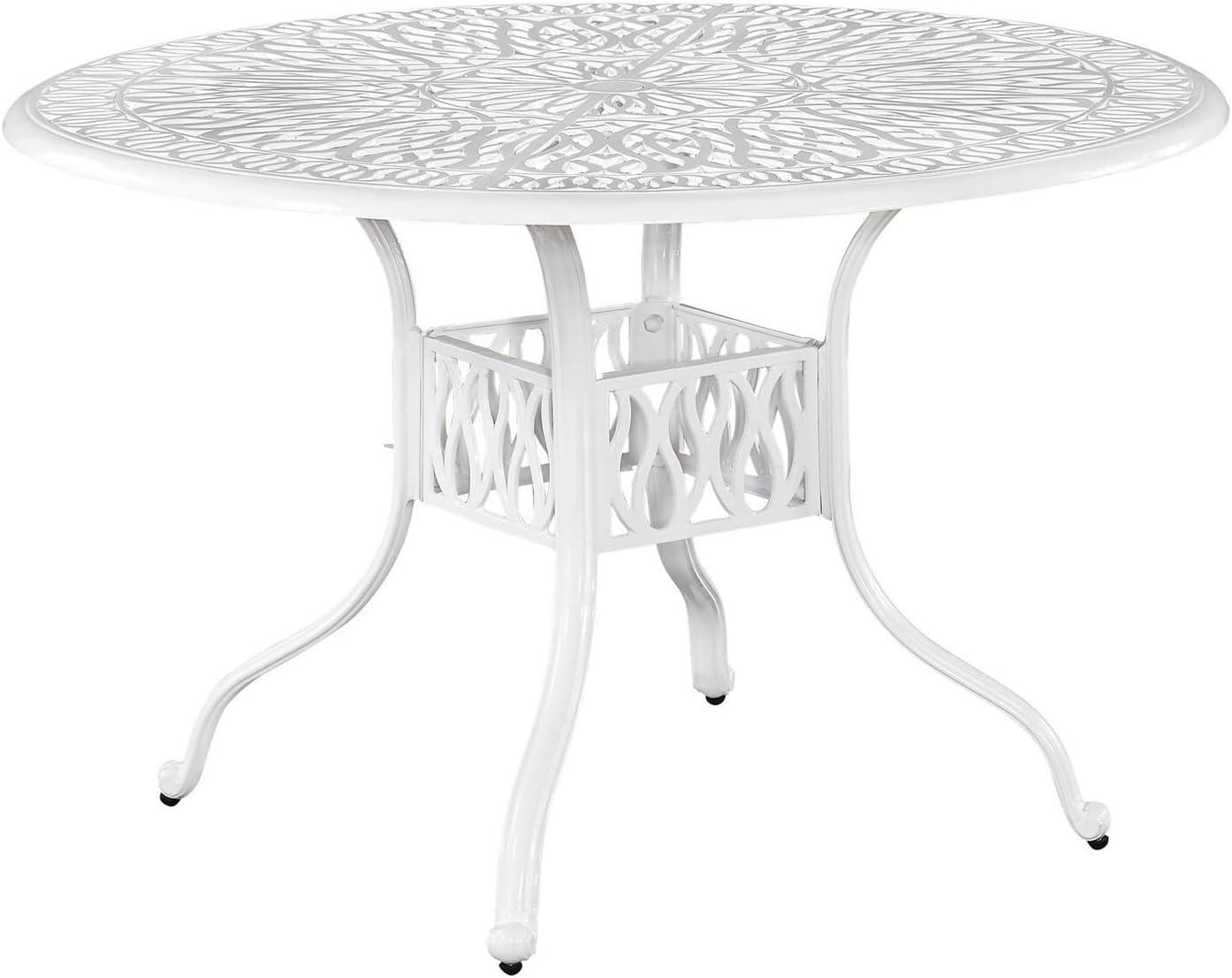 Stepping out with your coffee,you pause at a pale,round table that reads lighter than it looks. Its the Homestyles 6662-328 — the Capri five-piece in off-white — adn in the afternoon sun the powder-coated finish takes on a soft,chalky warmth. When you trail a hand along the edge the metal feels cool and solid, and the cushions give a firm, springy reply under your weight. You notice how four armchairs tuck in close so the arrangement occupies the patio with a quiet, pleasant presence rather than bulk. A small capped hole sits at the center of the table, and up close the floral tabletop throws lace-like shadows that make the whole set feel already settled into daily life.