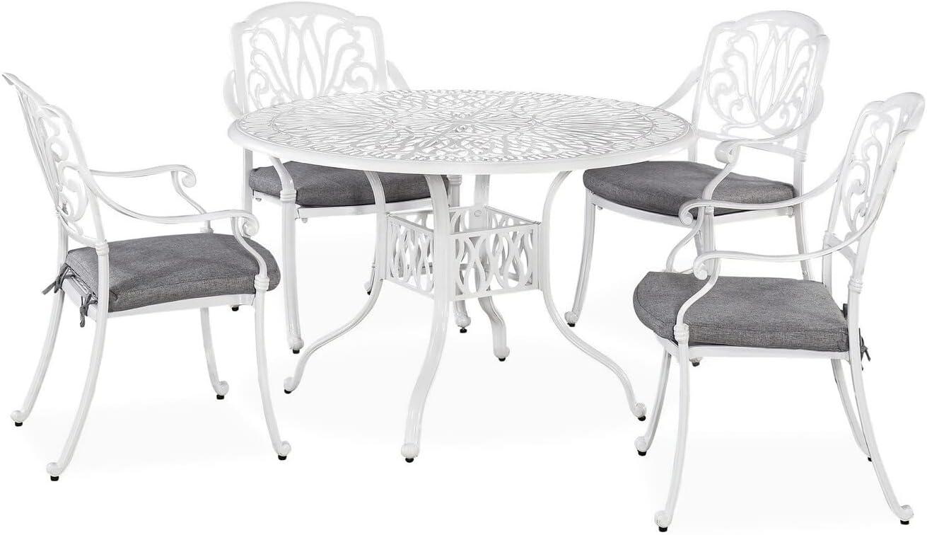 On first sight the set reads as a contained, conversational grouping rather than a sprawling dining installation. The off-white finish softens in daylight, where the tabletop’s floral motif catches and breaks sunlight into faint, shifting highlights; from a few steps back the pattern reads as a subtle texture rather than a bold print. Chairs tuck neatly around the round footprint, and the arm silhouettes form a low, continuous ring that helps the arrangement feel anchored on a patio or balcony. When occupied, cushions compress and the fabric develops small, short-lived creases along the seams, which tend to smooth out again after a rapid adjustment.