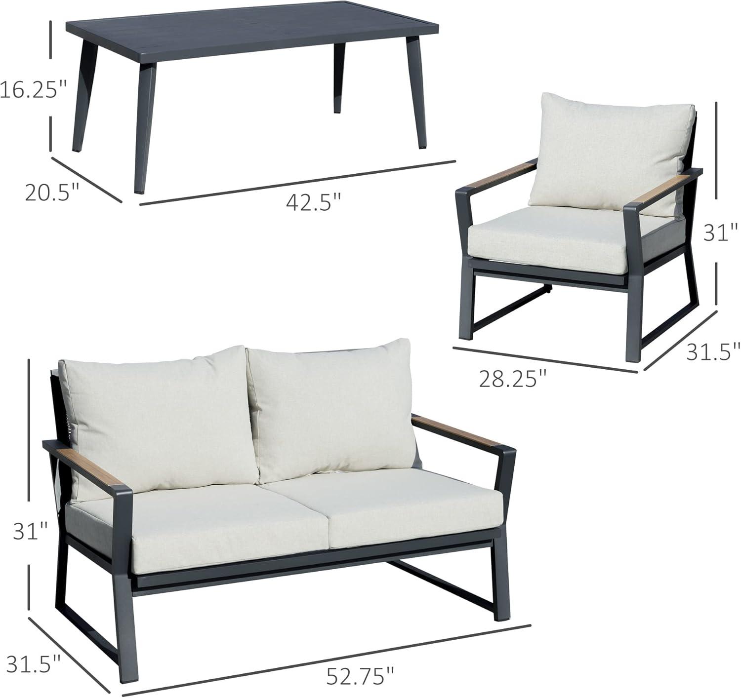 From the moment we set up this outdoor collection, it was clear that comfort and style were the top priorities in its design.The wide seats and high backrests paired with plush, cream white cushions invite you to sit back and relax, whether alone or with guests. The removable cushion covers add a practical touch, making maintenance straightforward. The aluminum frames feel sturdy yet lightweight, and the wood grain finish on the armrests lends a warm, natural accent that complements the neutral palette beautifully. It’s a set that seamlessly combines cozy lounging with an understated elegance, instantly elevating any patio or garden area.