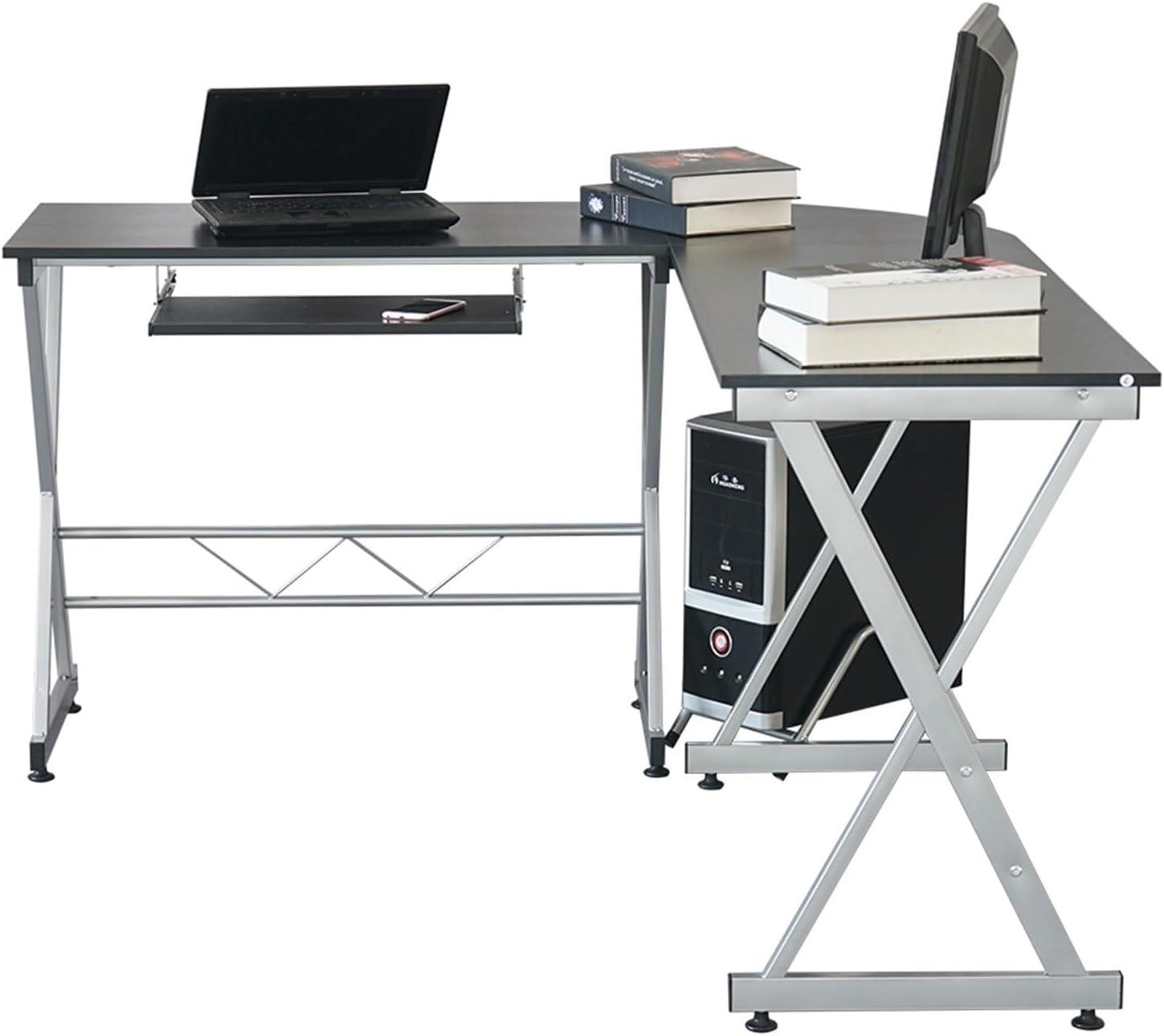 We found this corner desk to be an excellent addition to our workspace, striking the perfect balance between style and functionality. The L-shaped design creates an efficient corner setup, ideal for maximizing room usage whether in a bedroom, study, or dedicated office area. Crafted with a blend of sturdy plate surfaces and durable metal framing, it stands solidly firm without any wobble.The spacious desktop comfortably holds multiple monitors and various gadgets, while the sliding keyboard tray adds an extra layer of convenience, especially for gaming or typing sessions where ergonomics matter the most.