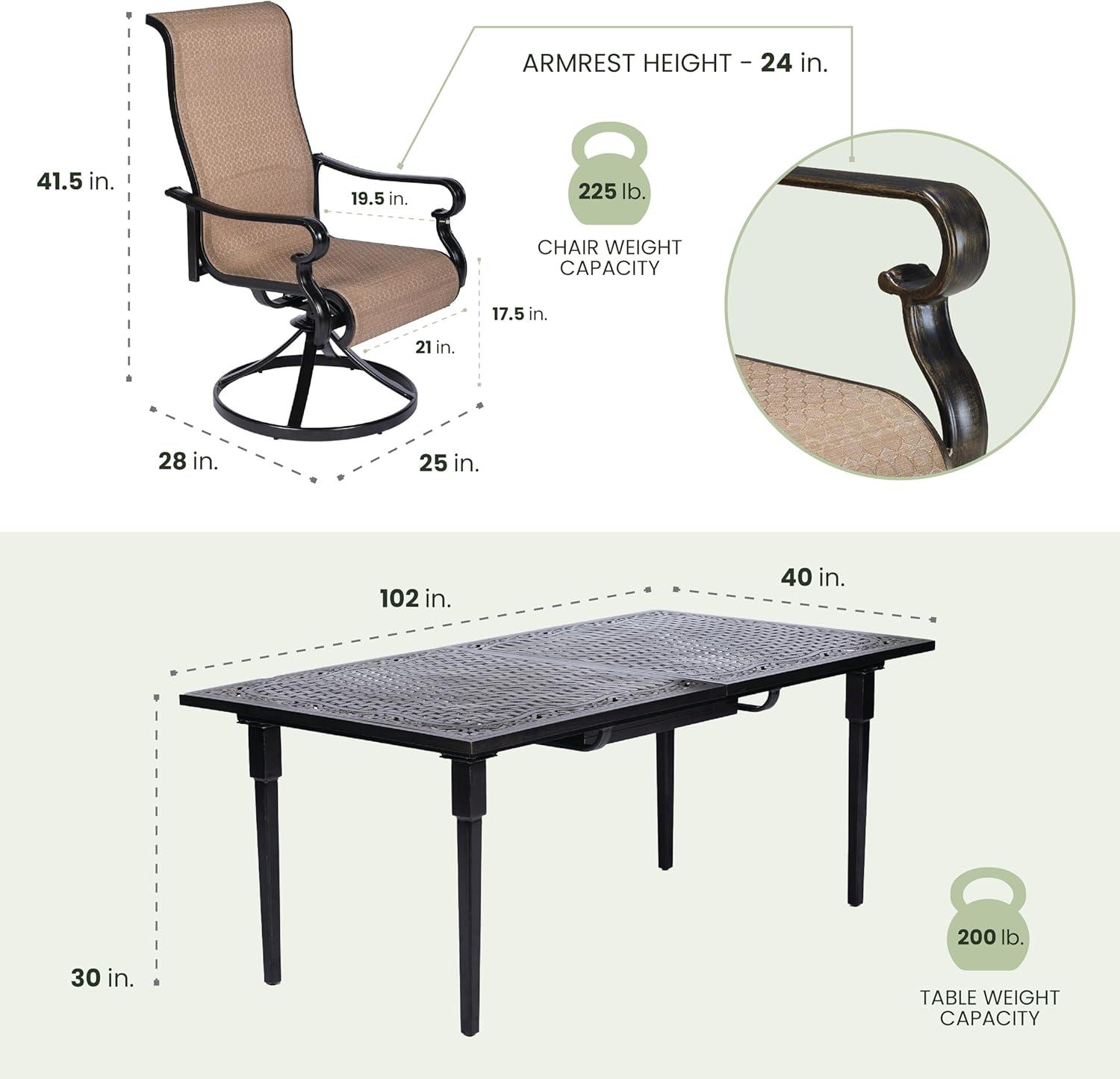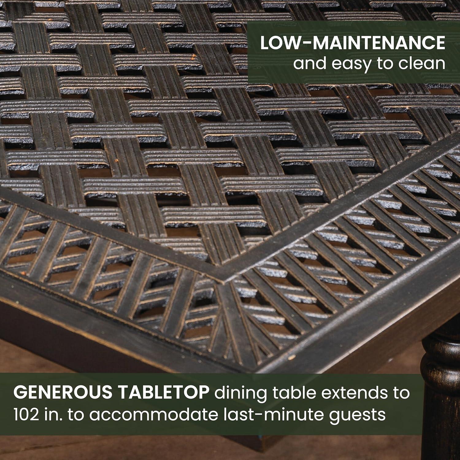 We appreciate the exceptional design and craftsmanship that goes into this outdoor dining set,built to endure the harshest of weather conditions while maintaining elegance. The cast aluminum construction features a multi-step, weather-protective finish that actively prevents rust and corrosion, assuring longevity no matter the season. The expandable rectangular table is not only practical but also stunning, with its intricate lattice and scroll patterns adding a coastal charm that complements any backyard or patio setting.Its ability to extend from 76 to 102 inches gives us the adaptability to host unexpected guests effortlessly.