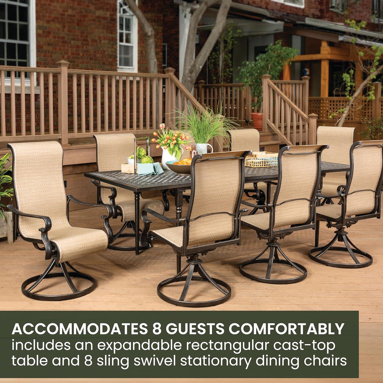 Designed to elevate any outdoor space, this 9-piece dining set combines style and functionality with ease. The expandable rectangular table effortlessly adjusts from 76 to 102 inches, providing extra room for unexpected guests without sacrificing aesthetic appeal. Its elegant cast-aluminum lattice and scrollwork tabletop showcases a coastal charm that blends seamlessly with natural surroundings. Each of the eight swivel rockers features contoured sling fabric that conforms to the shape of your back and knees, offering unparalleled comfort during long outdoor meals or gatherings.
