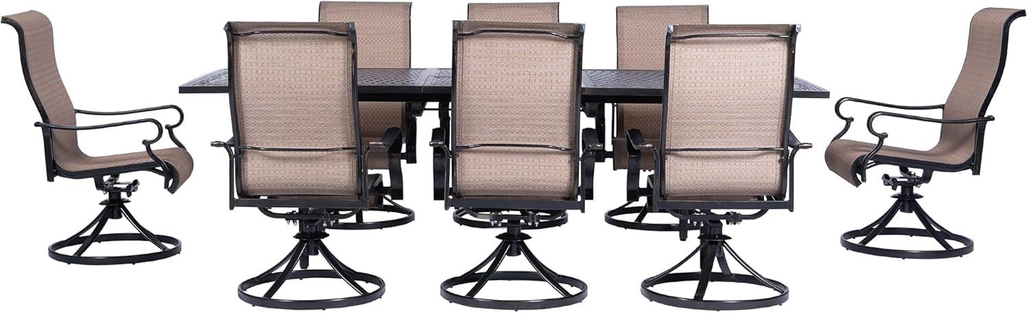 the flexibility of the expandable table brings both style and practicality, accommodating spontaneous gatherings with ease.Eight swivel rockers provide smooth 360-degree spins and gentle rocking motions, creating an inviting setting for relaxed conversations and shared meals. Beyond aesthetics, the quick-drying sling fabric resists fading and wear, ensuring the set maintains its fresh look season after season. This collection is a perfect blend of thoughtful design and durable materials, transforming our backyard into a elegant yet welcoming retreat.