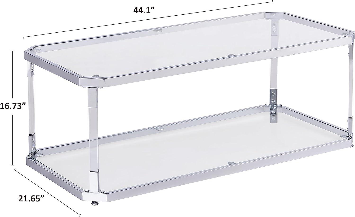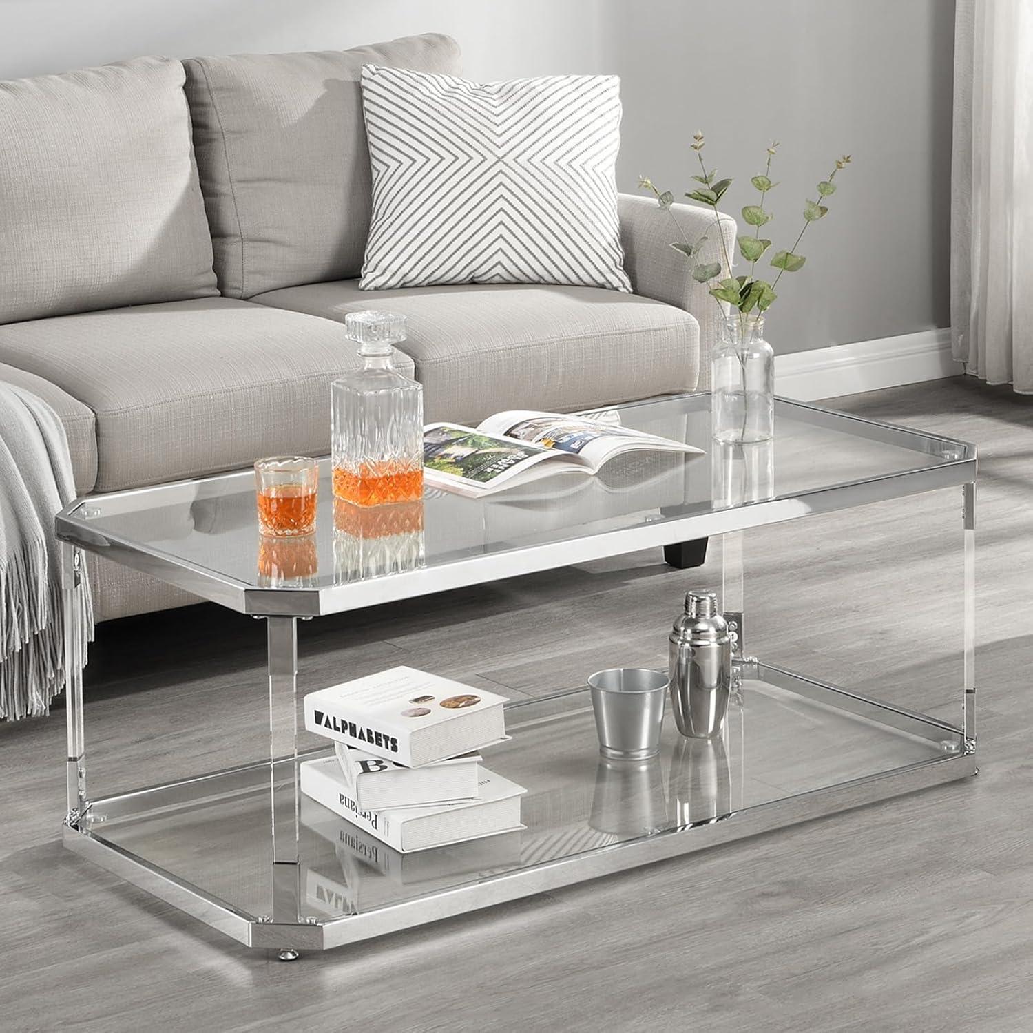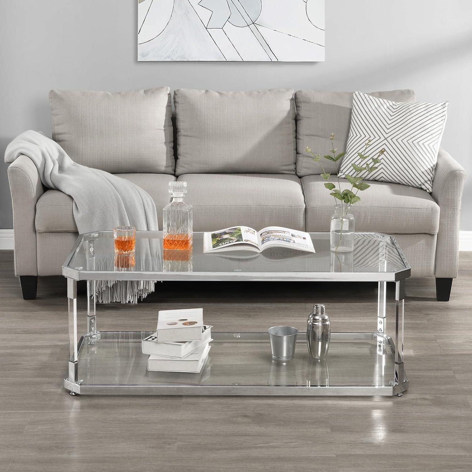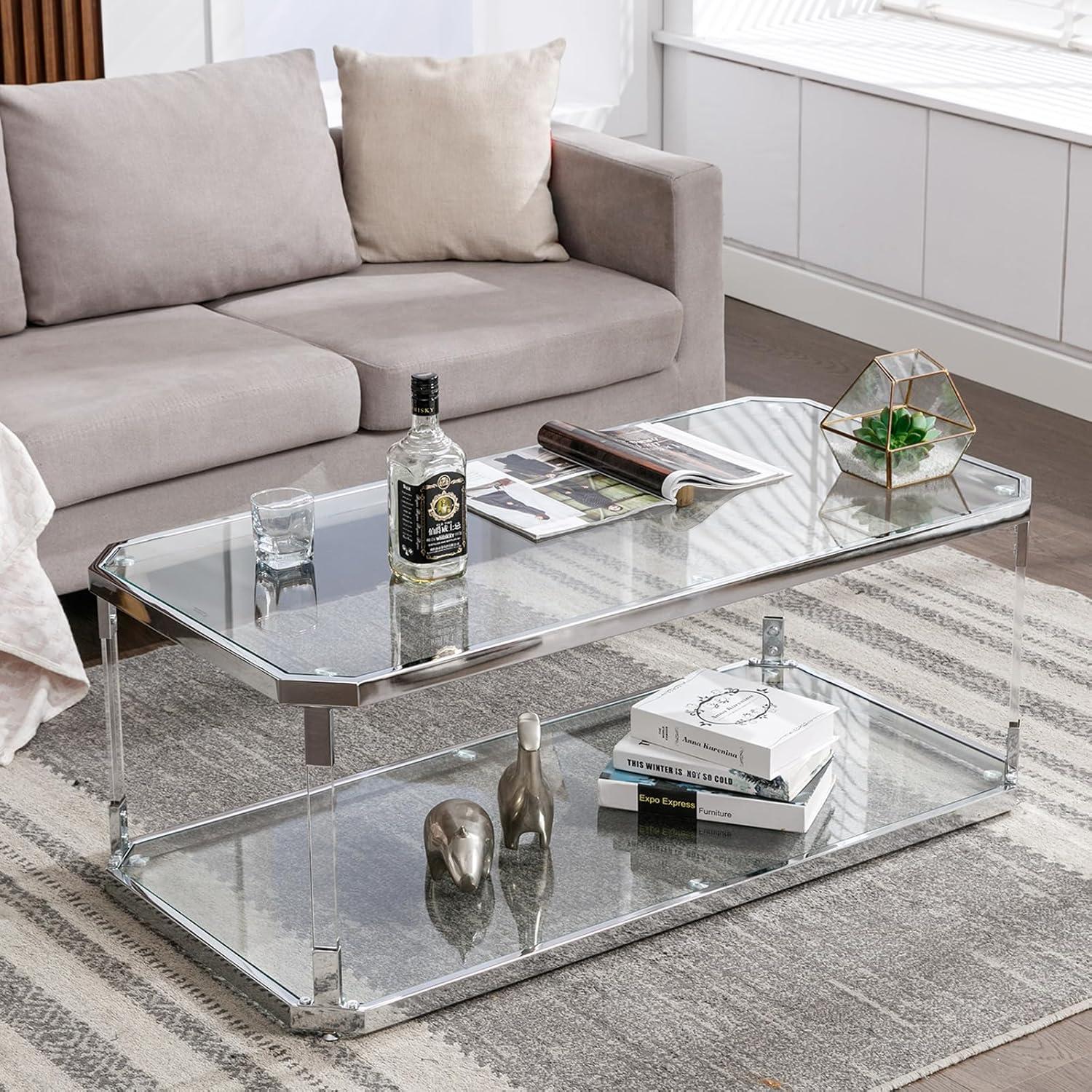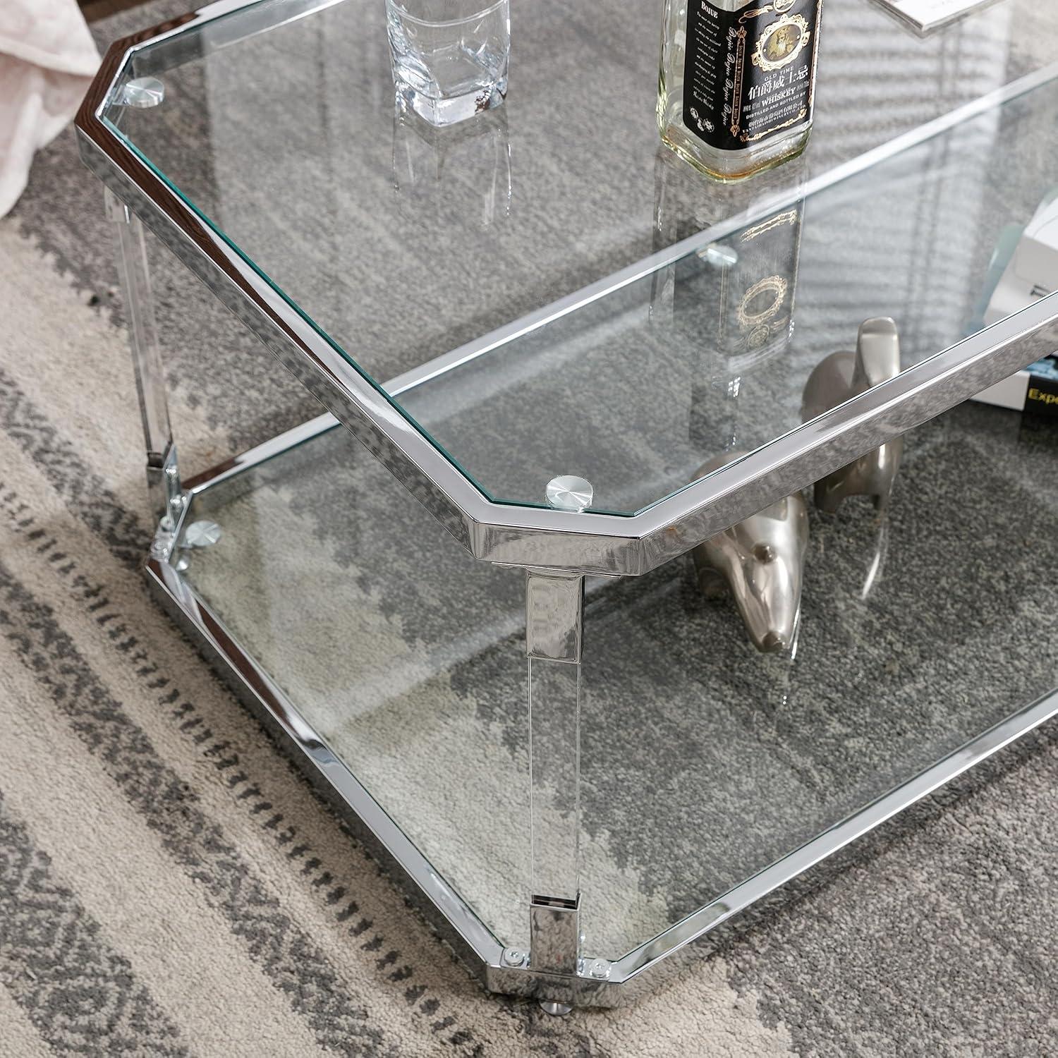 Our experience with this sleek, modern coffee table has been quite positive from the start. The ultra-clear tempered glass surfaces give it an elegant and airy feel, while the chrome-plated metal and acrylic legs add a touch of contemporary sophistication without compromising durability. We notably appreciated the two-tier design, which provides ample storage space for magazines, remotes, and decorative items without making the table appear bulky or overwhelming the room. The rectangular shape paired with beveled corners not only enhances safety – minimizing accidental bumps – but also elevates the overall aesthetic with a subtle yet unique flair.