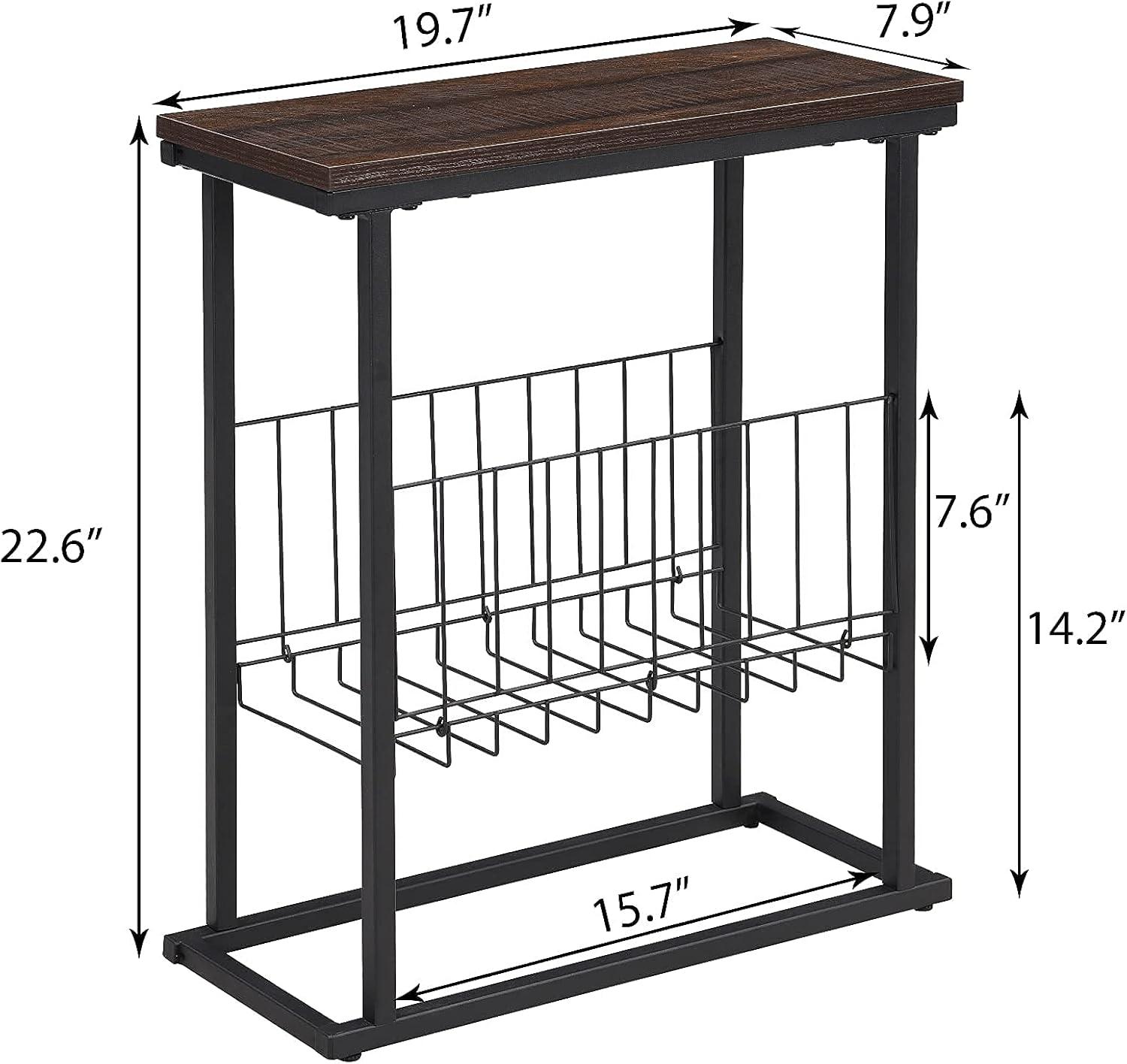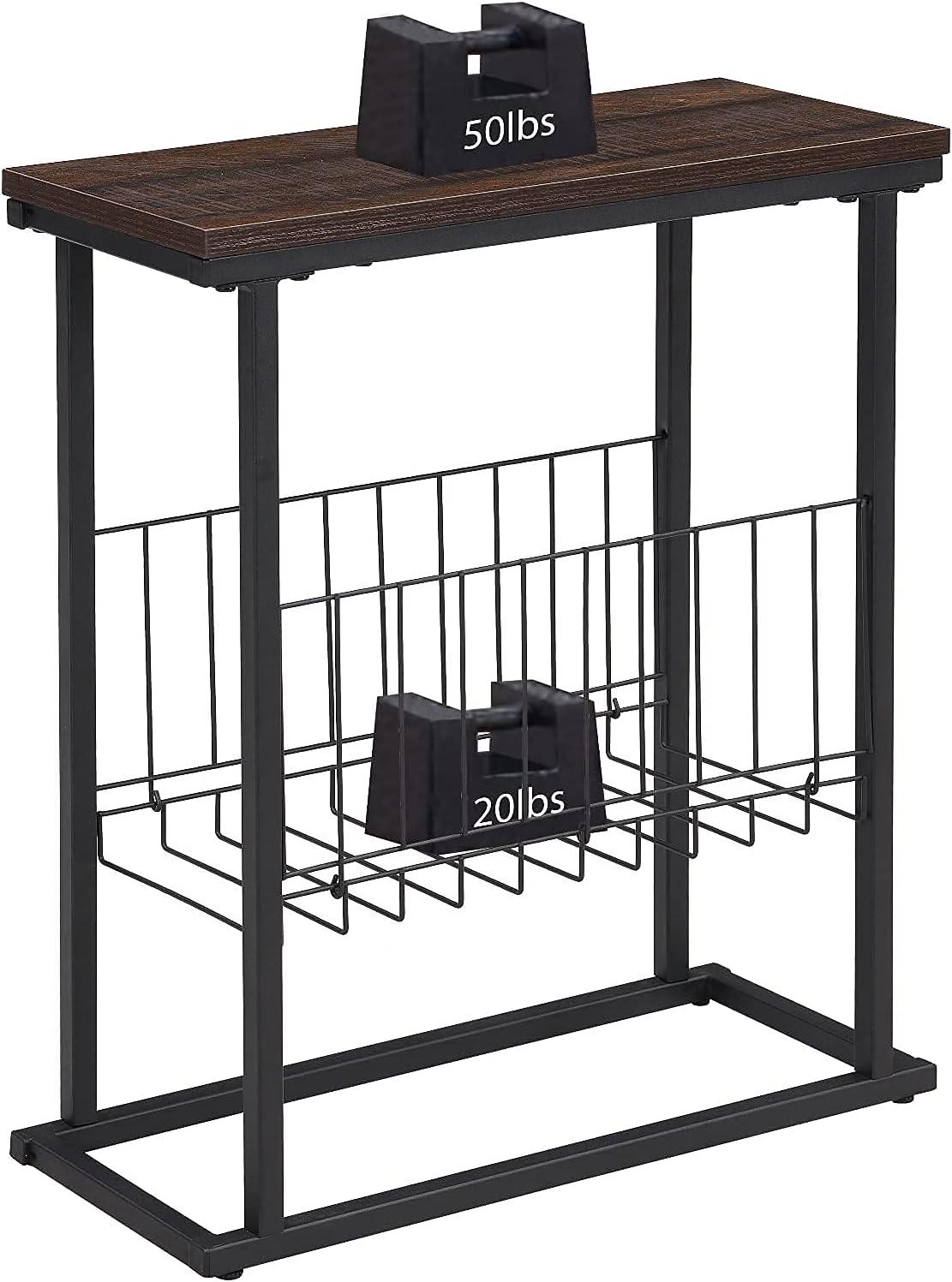 Our living room setup has truly benefitted from the seamless integration of function and style that this slim side table offers. Designed specifically for small spaces, it nestles perfectly into narrow gaps without crowding the room or hindering access to adjoining areas. The industrial espresso finish combines a rustic wood-grain tabletop with a sleek black metal frame, adding just the right touch of modern charm while maintaining durability. Beyond its aesthetic appeal, the magazine basket underneath keeps clutter at bay, making it easy for us to organize reading materials or miscellaneous items – a feature that brings both convenience and order to our daily use.
